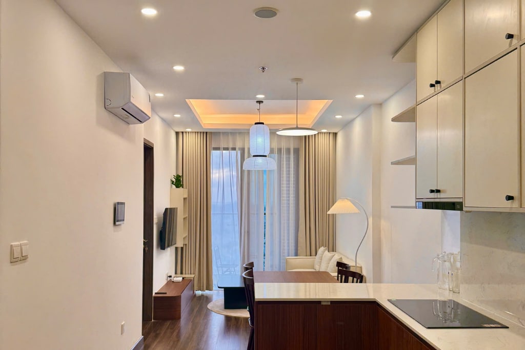 Cho thuê căn hộ 1PN 56 m², full nội thất, view thành phố – miễn phí Wi‑Fi Diện tích: 56 m², 1 phòng khách, 1 WC hoàn toàn mới 1 giường 1m8 đặt trong phòng ngủ chính 1 giường phụ 1m2 đặt tại phòng khách Tiện nghi đầy đủ: Máy giặt, quạt điện Nhà bếp đầy đủ đồ dùng + gia vị cơ bản Tivi 65″, tài khoản Netflix đầy đủ Điều hoà 2 chiều Đầy đủ bát đĩa, khăn tắm, dầu gội – sữa tắm Internet: Wi‑Fi miễn phí View: hướng city view đẹp, thoáng Tinh trạng: toàn bộ nội thất và trang thiết bị 100% mới