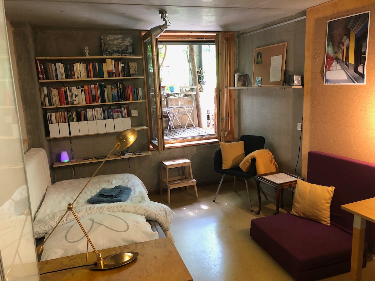 Küçük stüdyo, güzel bir ahşap hibrit binanın bahçe tarafındaki bodrum katında, Berlin-Friedrichshain'in merkezinde, U5 Samariterstraße ile Frankfurter Allee ve Ostkreuz S-Bahn istasyonları arasında, Boxhagener Platz'a yakın bir konumdadır. Oda, yazın hoş bir serinlik sunan, kışın ise yerden ısıtma sağlayan incir ağacının altındaki sakin küçük bir terasa doğru güneye bakmaktadır. Kendi duşlu banyosu ve girişi vardır, mutfağı yoktur, ancak Nespresso makinesi, su ısıtıcısı, ekmek kızartma makinesi ve fırın vardır.