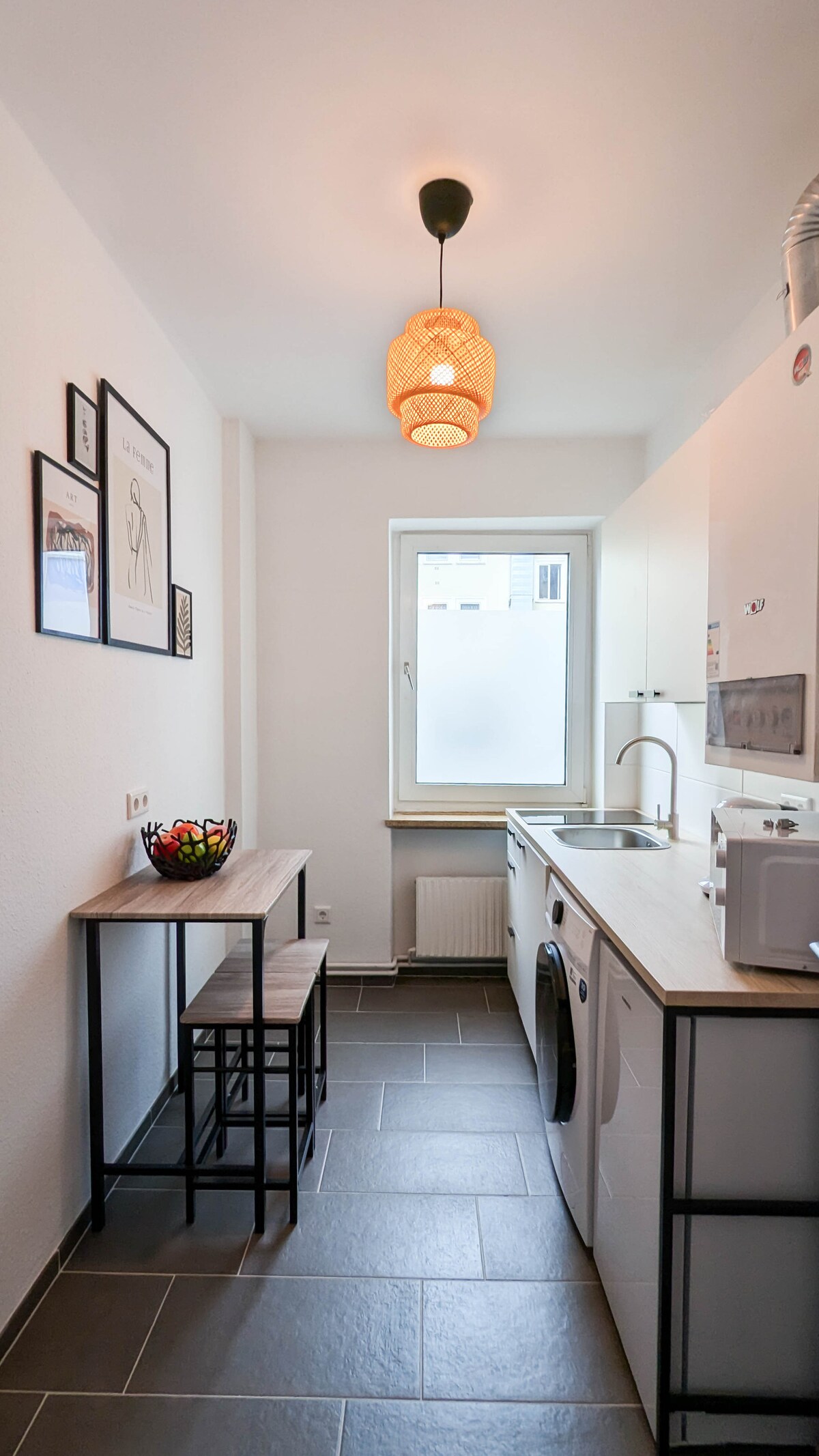 Yeni yenilenmiş, 50 m² daire (zemin kat), sessiz bir konumda, 3 misafire kadar idealdir. Çift kişilik yataklı yatak odası, ek uyku alanı olarak oturma odasında büyük kanepe. Bulaşık makinesi, kablosuz internet bağlantısı, büyük TV ile tam donanımlı mutfak. Bodrumda çamaşır makinesi ve kurutucu. Metroya 8 dakikada, otobüs durağı hemen kapının önünde. Bol ücretsiz otopark. İstek üzerine beşik ve mama sandalyesi. Kilitli kutu ile esnek, temassız giriş. Alışveriş ve kafeler yürüme mesafesindedir.