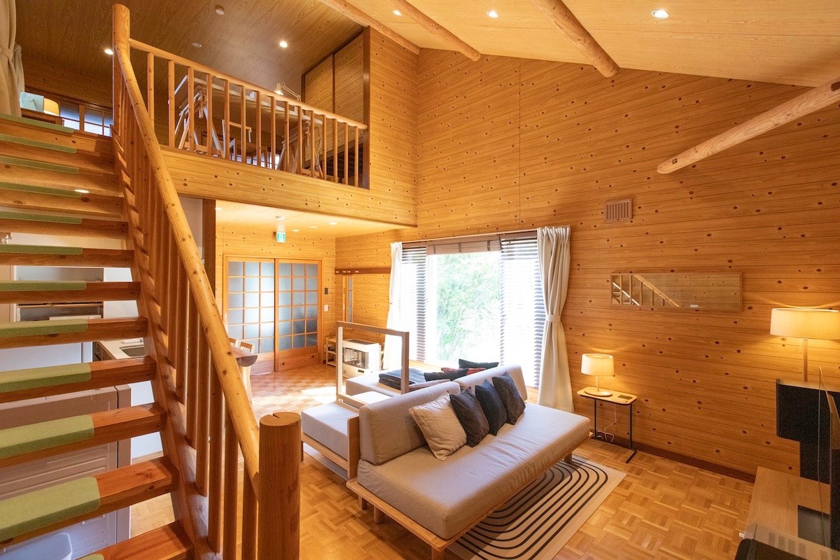 The first floor is equipped kitchen, dining room and living room. You can enjoy meal and chatting with your friends or family by surrounding a table. You can sleep on the second floor and there are "FUTON" for the number of people. The cottage has kitchen, gas kitchen stove, refrigerator, rice cooker, microwave oven, toaster, utensils, tableware, dishwashing fluid, sponge, Dust bin, toilet, washing machine for clothes, air cleaner, fire alarms, FUTON, TV, Wi-Fi, parking area.