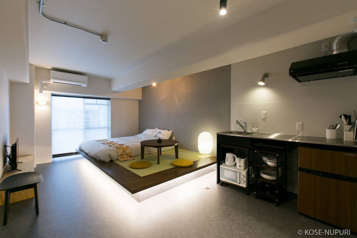 Konaklamanız için mükemmel bir konum. Yerel bölgeye 5 dakika yürüme mesafesinde. Hiroşima JR istasyonuna tramvayla doğrudan 15 dakikadan kısa sürede ulaşılabilir. Bu birim şunları sağlar: 1 Queen boy yatak Maksimum 4 kişilik konaklama için 2 Japon şiltesi. Tüm birim yenidir ve otel standartlarında olanaklar sağlar. Mutfak/banyo/kurutucu fonksiyonlu çamaşır makinesi ve odada kablosuz internet bağlantısı. Lütfen unutmayın: Temizlik, çıkış yaptıktan sonra yalnızca bir kez yapılır.