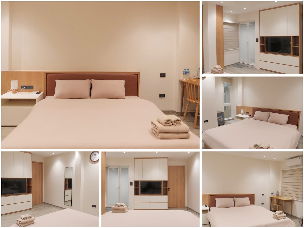 Palm House has 5 rooms(1room per floor). Room includes 1 Queen size bed, dining table, work/office table, 1 kitchenette area(just dish ware set), private bathroom, also wifi and smart TV. On the 4,5,6th rooms have a bathtub. !!! Because the 2nd and 3rd floors are low, it’s easy to hear the noise from outside. Be flexible to arrange a reasonable sleeping place for family members.