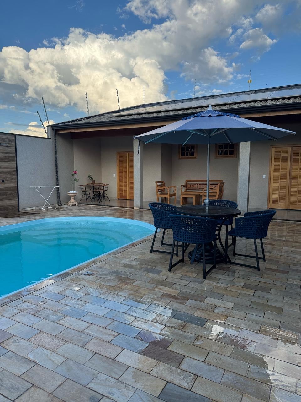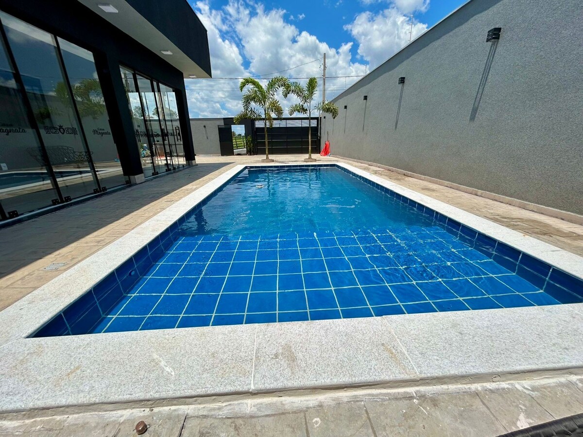 Relaxe com conforto, casa nova ,tranquila, bairro seguro , apenas 9 mim até os parques , próximo a comércios , muros altos , toda privacidade , câmera externa , portão automático, vaga pra 2 carros churrasqueira moderna , pia interna e externa , iluminada , todos utensílios, eletrodomésticos, geladeira frost free,ventiladores de teto , ar condicionados , Tv na sala Roku ,piscina climatizada com placas solares , 6 mtrs , 1,40 mtr profundidade ,hidro ,cascata, luz led , wc piscina