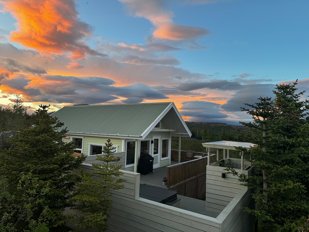 Terasta jakuzili 48 metrekarelik güzel bir ev. Evin biri çift kişilik yatağı, diğeri çift kişilik yatağı ve bir tek kişilik yatağı olan 2 rahat yatak odası vardır. Oturma odasına açık tam donanımlı mutfak. Oturma odasında büyük bir televizyonu olan büyük ve konforlu bir kanepe vardır. Duş imkanlı banyo. Dış gazlı ızgara. Ücretsiz kablosuz internet bağlantısı. Nevresim takımları ve havlular sağlanır. Mülk, en önemli turistik mekanlara yakın pitoresk bir ortamda bulunmaktadır: Golden Circle, Gulfoss, Geysir vb.