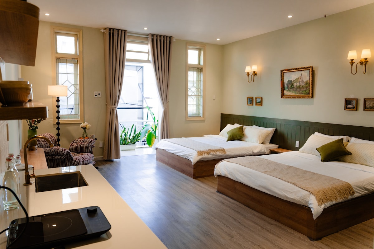 Hue'un kalbinde eskiyle yeninin buluştuğu Le Robinet Villa'ya hoş geldiniz. Yerimiz İmparatorluk Şehri'nin içinde, Kaleye sadece birkaç adım uzaklıktadır. Her şey çevrenizde olacak: restoranlar, mağazalar, kafeler, ... Ev, Vietnam yaşam tarzını hissetmenizi sağlayacak Vietnam'ın temel geleneksel mobilyalarıyla donatılmıştır. Her odanın Main Street manzarasına ulaşmak için kendi geniş penceresi vardır. Geniş balkonda güneş ışığı ahşap mobilyaları yaptı ve zemin daha "Huế" gibi görünüyor.