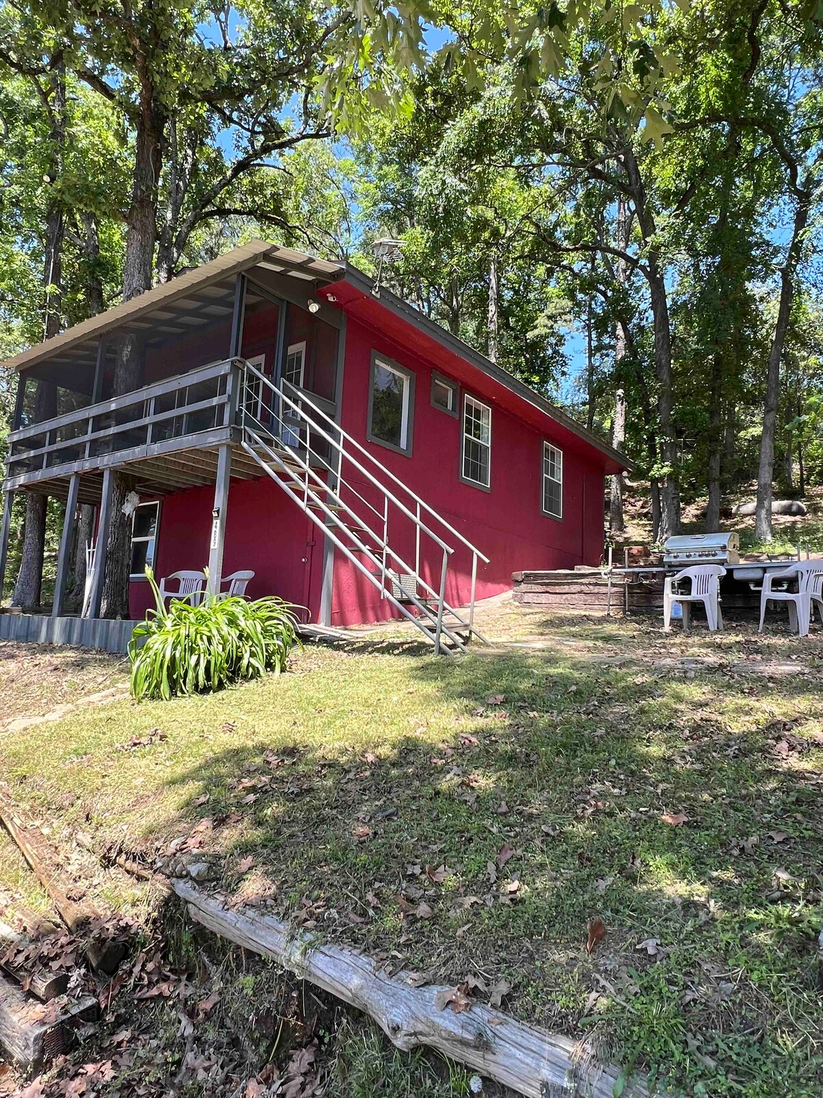 Lake of the Pines'ın köşesinde rahat bir kulübe. Son derece arzu edilen Crestwood semtinde ve Johnson Marina'daki tekne rampasına bir milden daha az uzaklıkta. Güzel bir göl manzarasına açılan büyük cumbalı pencerelere giden yüksek, tonozlu tavanları olan bu küçük kırmızı kulübeden göl hayatının tadını çıkarın. Ev, 2 özel yatak odası ve yatak haline getirilebilen iki kanepe içeren açık bir yaşam alanı ile 9 kişiyi rahatça barındırır. Doğu Teksas'taki en iyi göllerden birinin tadını çıkarın!