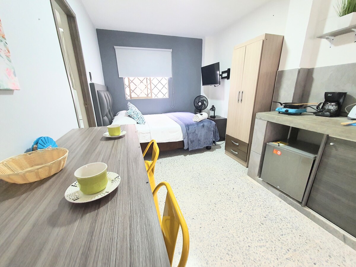 Cali'nin göbeğinde büyüleyici bir daire - stüdyo. Şunlara sahiptir: Queen boy yatak, yarı ortopedik şilte, klima, akıllı TV, çalışma alanı, yüksek hızlı internet, dolap. Tam banyo, sıcak su duşu. Tam donanımlı mutfak. SOFACAMA Pan American Courts, Pascual Guerrero Stadyumu, Palmetto Plaza, Mallplaza, Cosmocentro gibi alışveriş merkezlerine ve şehirdeki Imbanaco ve Farallones gibi ana kliniklere yakındır.