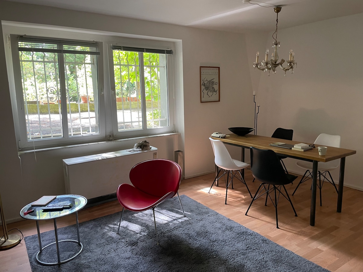 Charmante, am Grunewald gelegene Wohnung mit dem Diana-See im Rücken und dem fussläufig erreichbaren Grunewald-See. Schlachtensee und Krumme Lanke 5 Minuten weiter. Schöne Villengegend. Zahlreiche hochwertige und interessante Restaurants und Cafés „um‘s Eck“.Die City nah, die Koenigsallee ist die Verlängerung vom Kurfürstendamm. Separater Eingang, 3 Stufen runter. Grosses Wohnzimmer und Fenster, integrierte kleine und vollausgestattete Küche. Schlafzimmer separat zur Gartenseite gelegen. Hell