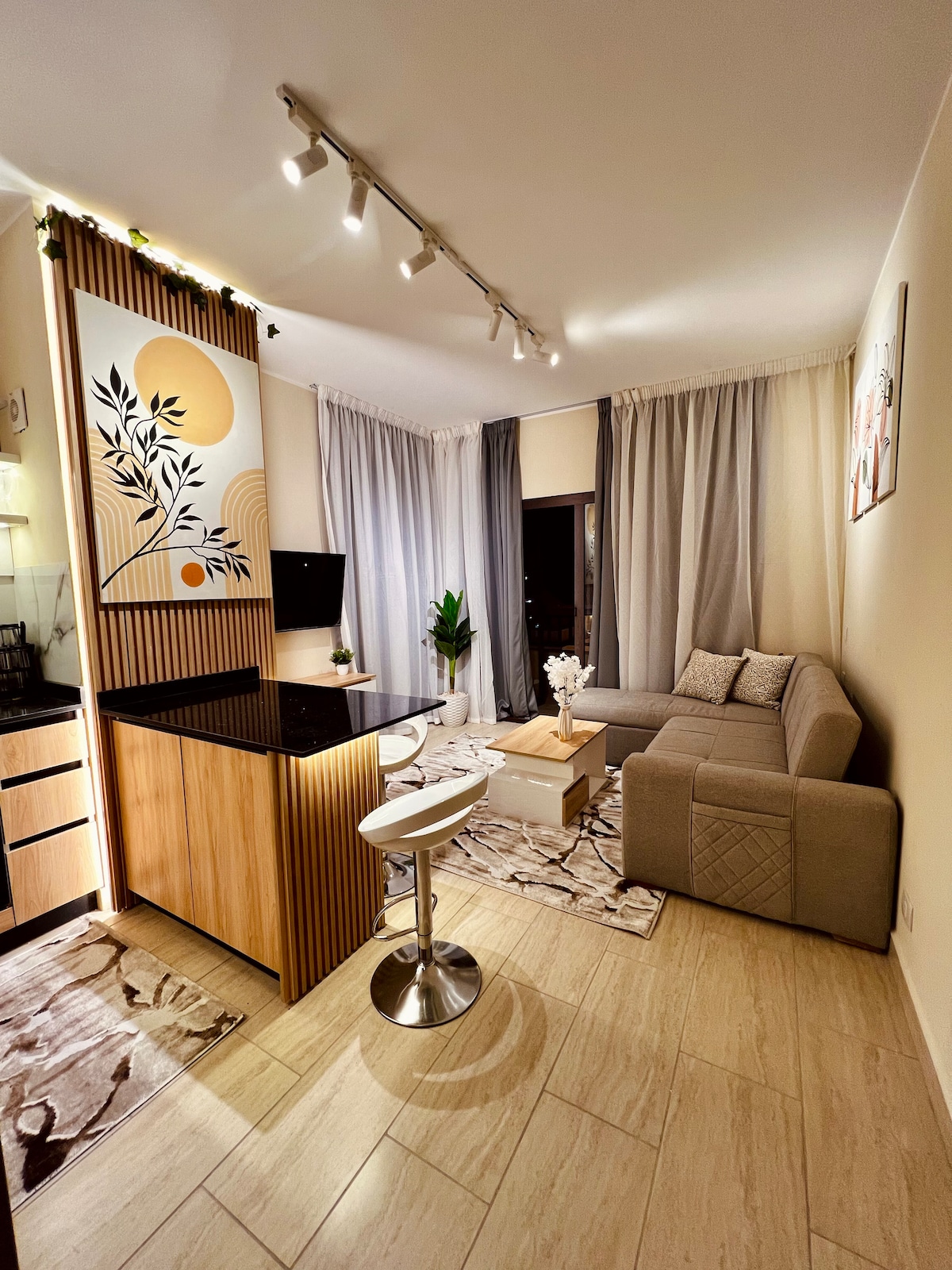 İki yatak odası ve harika bir deniz manzarasına sahip bir resepsiyon ve resepsiyonda çok rahat bir yatakta veya resepsiyonda kanepede uyuyan denizi görebileceğiniz, manzaranın güzelliğiyle sakinleşebileceğiniz bu zarif konutta tüm ailenizle birlikte keyfini çıkarın ve gün doğumundan gün batımına kadar sağlıklı güneş ışığının yayıldığı dairenin balkonunda dinlenebilir, ayrıca zeminde havuzda da dinlenebilirsiniz.