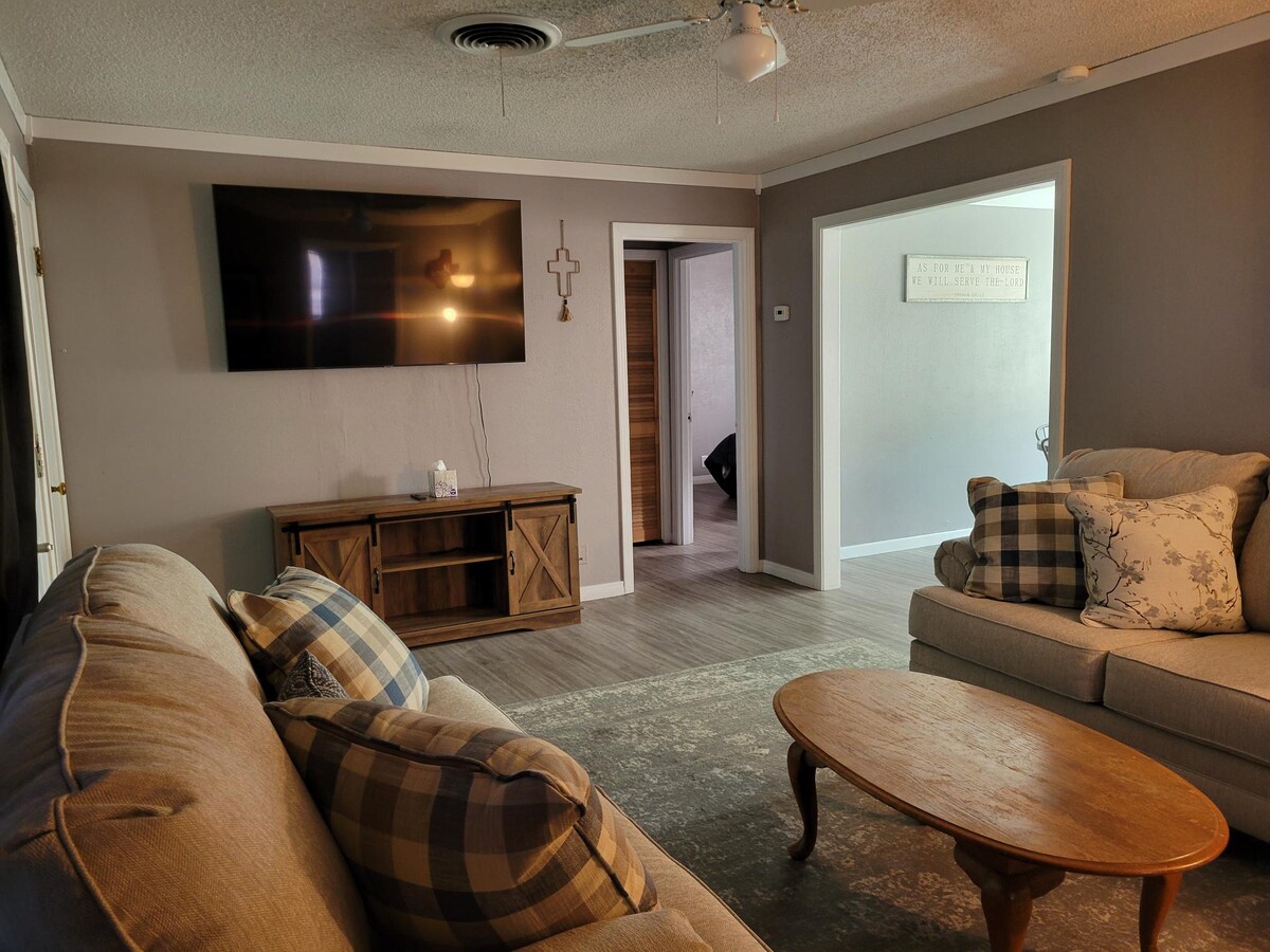 Borger, Teksas'ta çekici, rahat bir kır evi. Rahat yataklar (biri king, biri queen). Direct TV ve kablosuz internet bağlantısı. Gazlı ızgaralı güzel arka bahçe alanı. Donanımlı mutfak. Çamaşır ve kurutma makinesi. Bir araba için kapalı park yeri.