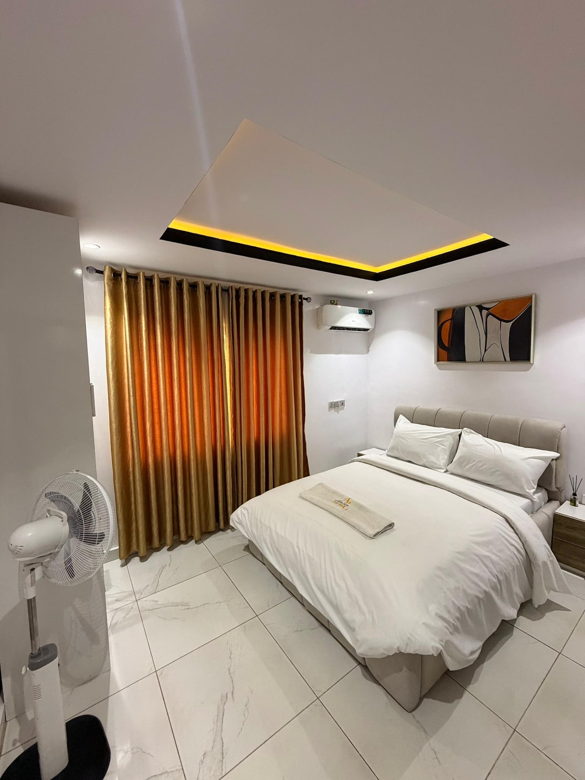 Güzel, şık ve iyi havalandırılmış birinci sınıf otel olanakları sunan möbleli daireler, İbadan Üniversitesi'ne sadece 3 dakika yürüme mesafesinde, sakin ve güvenli bir ortamda kısa süre için uygundur. Tesisler arasında; 24 Saat Güneş Enerjili İnvertör Güç Kaynağı, Kablosuz internet bağlantısı akıllı TV (Netflix vb.) Klima, ebeveyn banyosu Mikrodalga ve Buzdolabı ile tamamen mobilyalı mutfak, Arıtılmış Su temini, Özel Gotv dekoder, Ücretsiz çamaşırhane, CCTV, 24 saat güvenlik görevlileri, Özel Adaptör, Elektrikli çit sistemi, Otopark