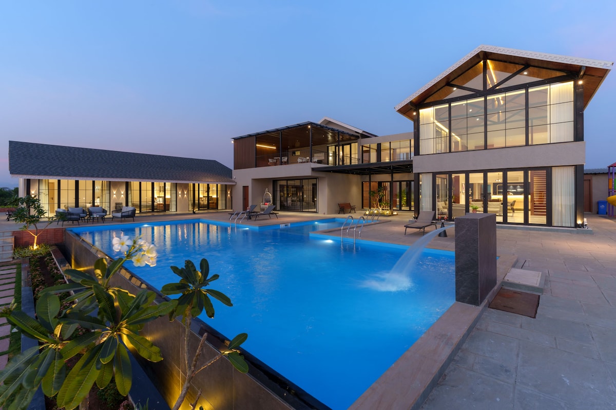 A serene 7-BHK hillside villa in Igatpuri, ideal for families and groups seeking comfort and privacy.The villa features spacious bedrooms with soothing views, sun-filled living and dining areas, private pools, & a striking glass room- perfect for slow mornings and relaxed evenings.Thoughtfully designed for comfort and quiet luxury, this nature-surrounded retreat just 6 km from Bhawali Waterfall and Sunset Point offers ample space to unwind, reconnect, and enjoy extended stays.