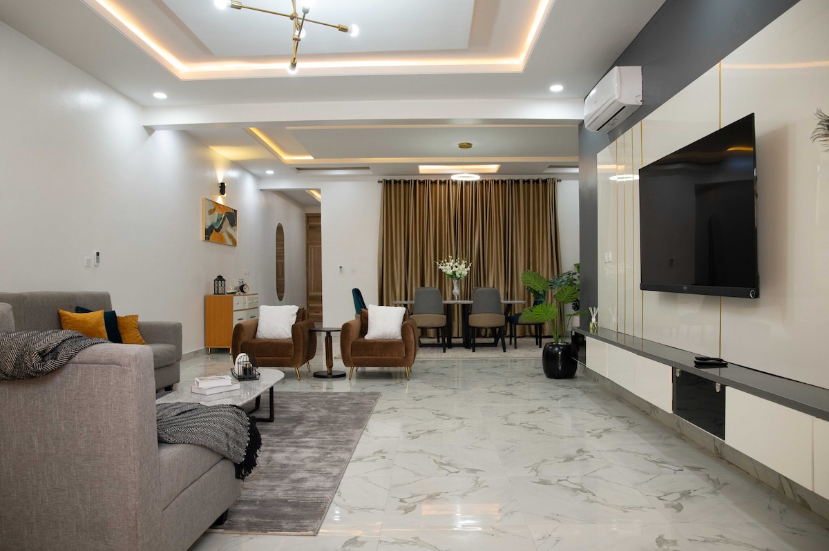 Lekki Ikota'daki şık inziva yeriniz Elmstead Luxury Apart'a hoş geldiniz. Bu 2 yatak odalı/2 banyolu cennet, klima konforu, oturma odasında 65 inç TV, yatak odalarında 43 inç TV, ücretsiz sabit sınırsız kablosuz internet bağlantısı ve invertör ve güneş enerjisi ile 7/24 güç sunar. Akıllı kilitle kendi kendine giriş, ücretsiz park yeri, konaklama biriminde çamaşır makinesi ve çocuklar için şişme şatonun keyfini çıkarın. 5-6 geceden uzun konaklamalar için 1 ücretsiz temizlik. Lekki Koruma Merkezi, Mega Chicken, Blackbell ve Blemco'ya yakın. Yalnız seyahat edenler, iş için seyahat eden misafirler, aileler veya uzun süreli konaklamalar için mükemmeldir.