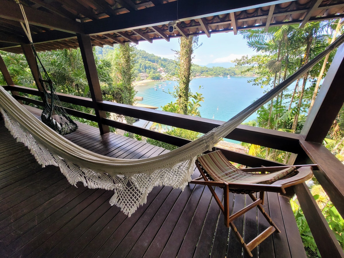 2 katlı dağ evi ve Atlantik Ormanı ile çevrili denize bakan bir bakış açısı. 2 yatak odası, ofis, çardağa erişimi olan üst güverte, donanımlı mutfak, Netflix'li TV odası, banyo, tamamen çitle çevrili arka bahçe, duş, barbekü ve meyve ağaçlı bahçe bulunmaktadır. Mülkün her yerinde Wi - Fi var. İskeleye sadece 10 dakika, Vila do Abraão mağazalarına 7 dakika mesafedeyiz. Burada sadece konaklama değil, aynı zamanda doğaya dalma deneyimi: