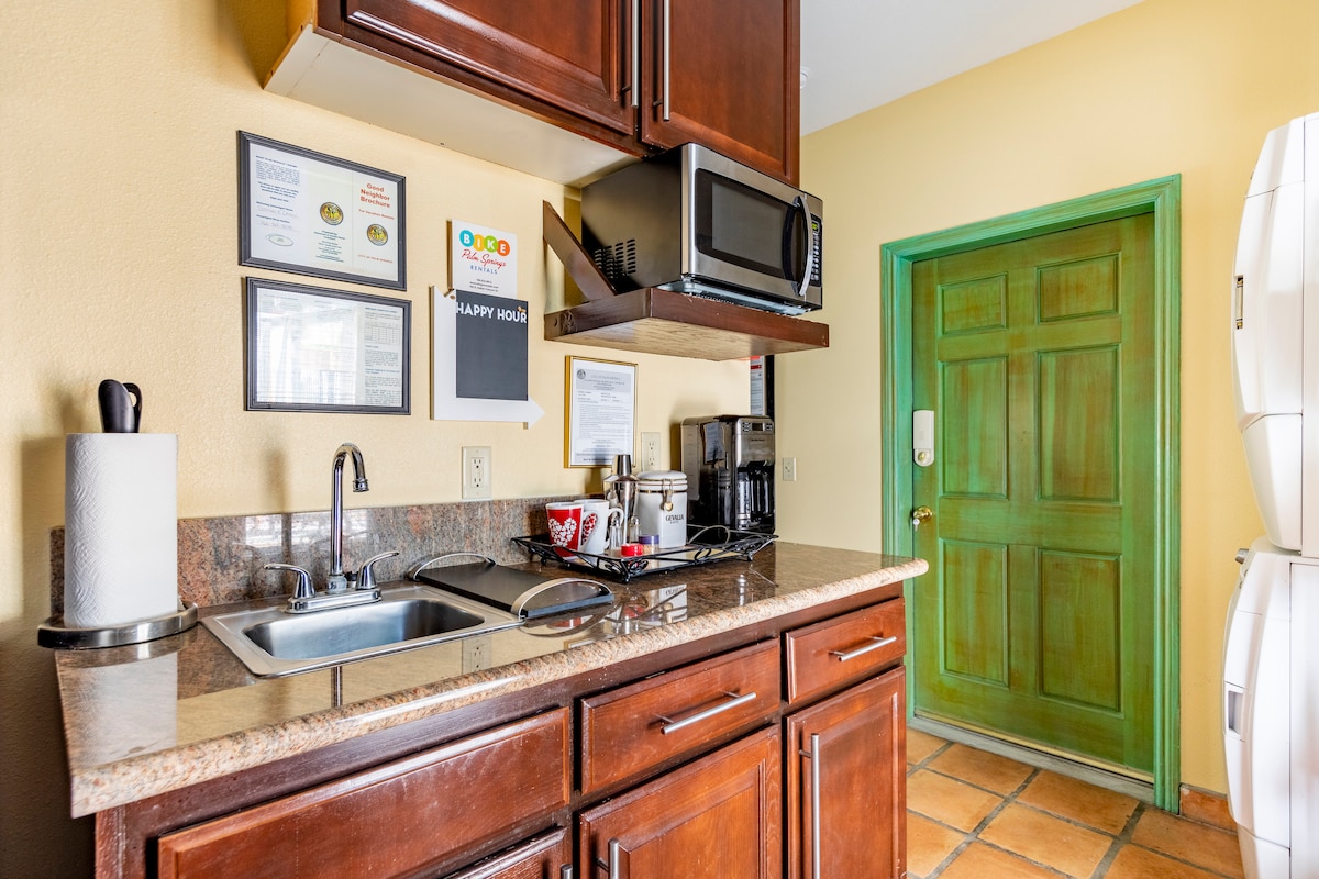 Çöle kaçın, ancak sessiz ve güvenli bir semtteki bu güncellenmiş özel Casita'da kendinizi evinizde gibi hissedin. Özel bir girişten girin ve yeni hafızalı köpük king boy yatak, yeni mini mutfak ve havalı bir yüzyıl ortası modern havası da dahil olmak üzere bu mekânın özelliklerinin tadını çıkarın. Konum mu? Size yardıma hazırız. Indian Wells Tennis Garden - 2,7 mil Coachella/Stagecoach - 8,5 mil Acrisure Arena - 4,3 mil Palm Springs - 20 mil Starbucks, marketler, barlar ve restoranlara yürüme mesafesindedir.