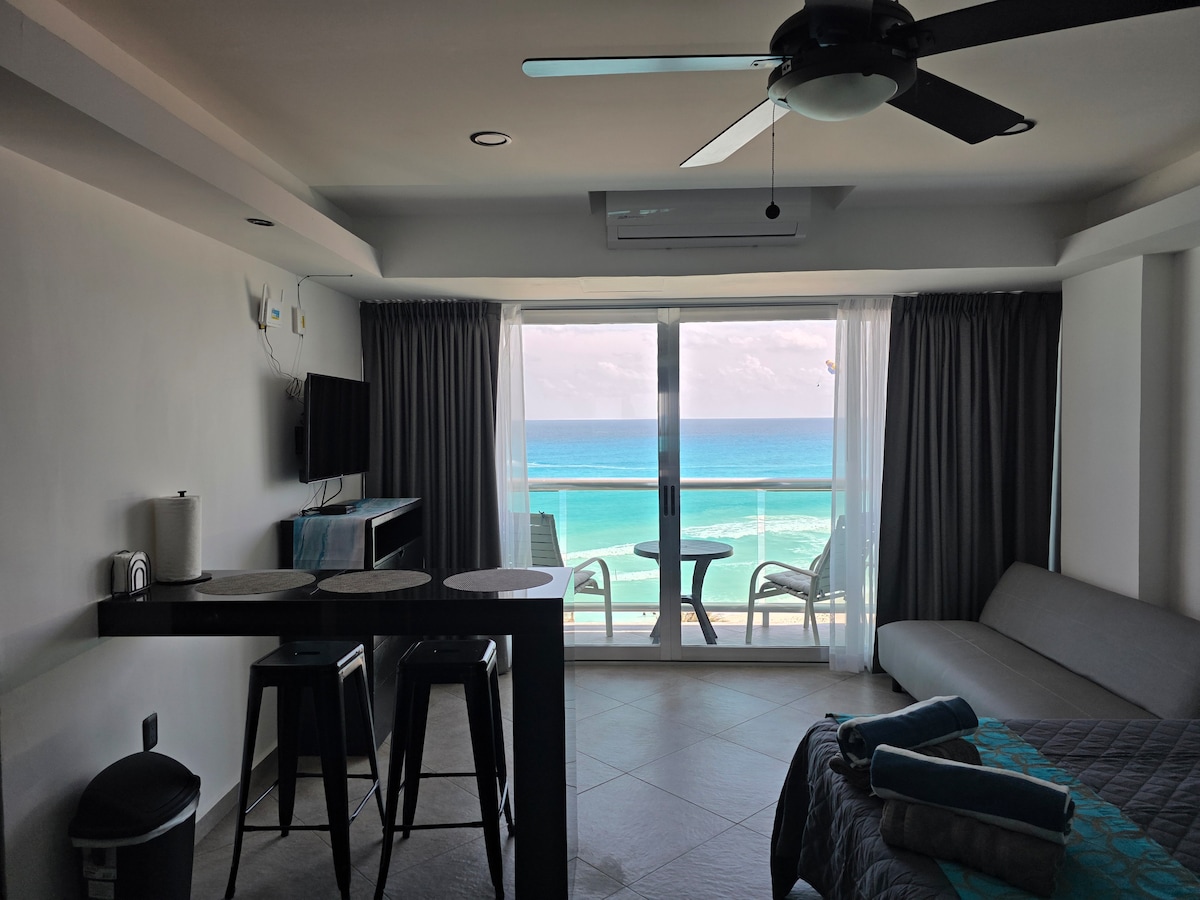 Yakın zamanda yenilenmiş stüdyo, Cancun otel bölgesinin tam kalbinde, güzel bir teras ve nefes kesen bir okyanus manzarası ile restoranlara ve gece canlı eğlence etkinliklerine yakındır. Stüdyo, vakit geçirmek ve bir fincan kahve, biraz şarap veya sadece hamakta dinlenerek manzaranın ve okyanus seslerinin tadını çıkarmak için güzel bir terasa sahip modern bir dokunuşa sahiptir. İki queen boy yatak, bir kanepe tipi yatak, iyi donanımlı bir küçük mutfak ve bir yemek masası vardır. Ayrıca düz ekran TV ve kablosuz internet bağlantısı da mevcuttur.