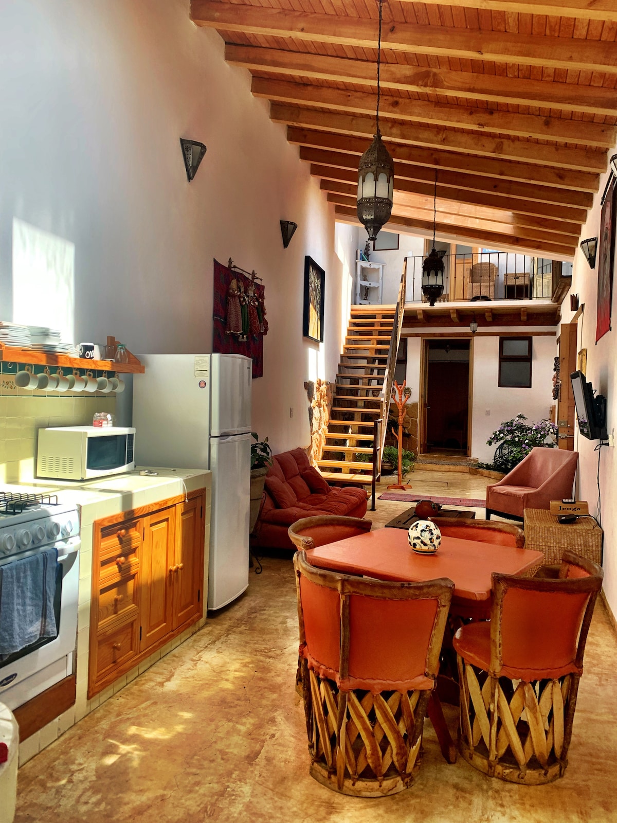 Pátzcuaro'nun romantik Centro Histórico'sunda, ikonik Mirador'un yanında ve 16. yüzyıl Cizvit Koleji'nden birkaç adım ötede rüya gibi bir sığınak olan Casita Jardín Mágico'ya hoş geldiniz. Vardığınızda, 300 yıllık bir troje, nadir bir Purépecha ahşap hazinesi geçecek ve kuş cıvıltıları, çiçekler ve bir Lima ağacıyla dolu yemyeşil bir bahçeye adım atacaksınız. Gün batımı balkonunuzda yerel kahve yudumlayın, zanaatkârın cazibesine kendinizi bırakın ve tarihin sessizliğini hissedin. Fiber optik kablosuz internet bağlantısı, köpek dostu, saf sihir.