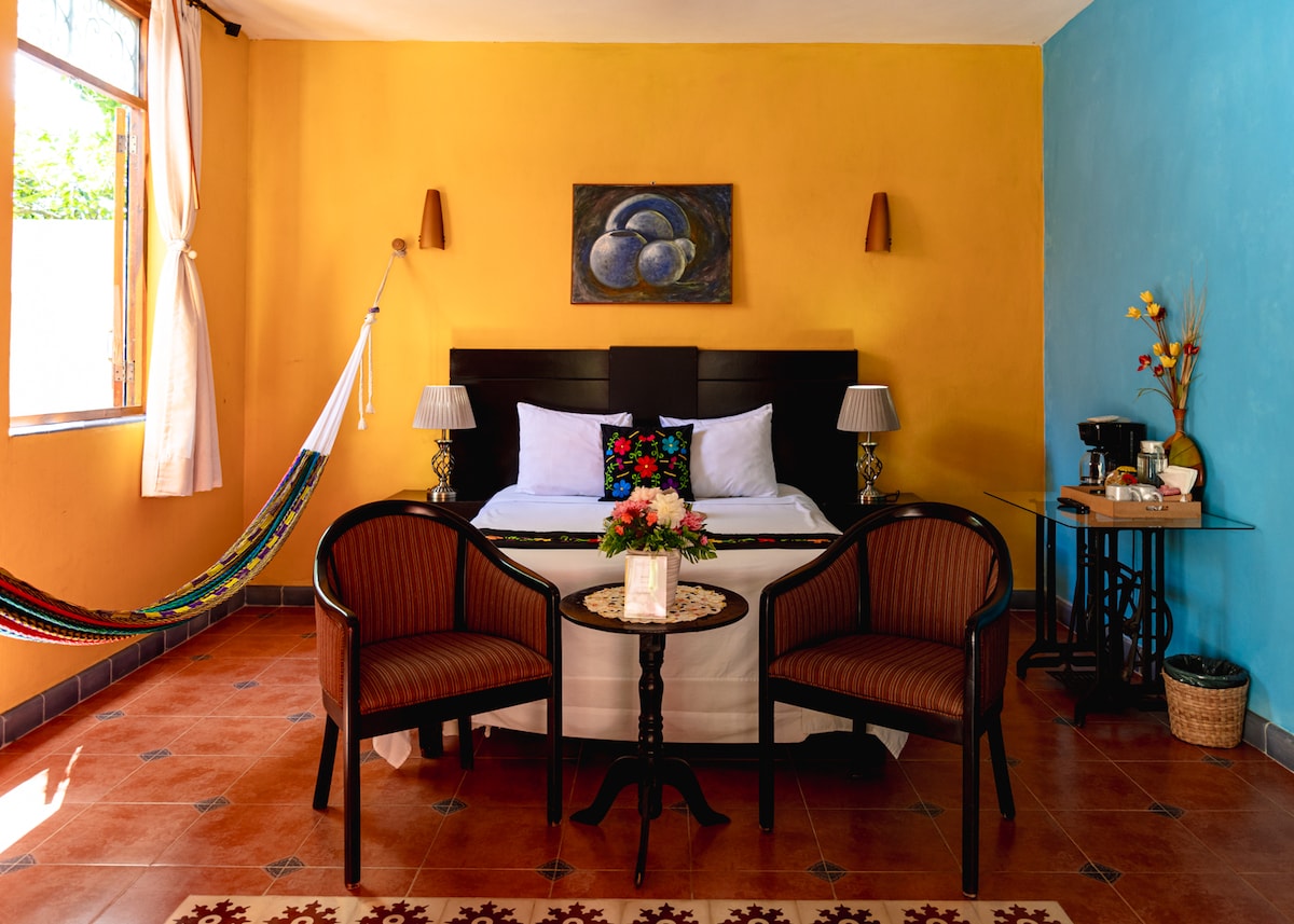 This tidy house, just two blocks from the convent, mercado, and Centro, is perfect for large families/groups, as there are 3 beds and two hammocks in the huge bedroom, and three hammocks in the dining room, and now a 2nd toilet and shower out back. There is an AC in the living room and in the bedroom. There is good internet, and a 42" flat screen for streaming videos. Breakfast includes eggs, bread, milk, cheese, cereal, jam, butter, coffee and tea. Huge secure back yard for your pets to roam.
