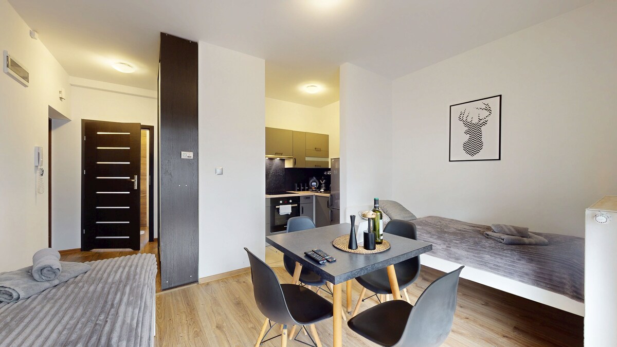 Daire, Bytom'un sakin, yeşil bir bölgesinde, yenilenmiş bir apartmanın birinci katında bulunmaktadır. Misafirler için: iki yataklı ve çalışma alanlı geniş bir oda, yemek odalı tam donanımlı bir mutfak, tuvaletli bir banyo ve bir antre bulunmaktadır. Yakınlarda, Tarnowskie Góry, Zabrze ve Bytom'a doğrudan bağlantıları olan mağazalar ve otobüs durakları bulunmaktadır. A1 otoyolunun en yakın girişine 5 dakika. Katowice-Pyrzowice havaalanına 20 dakika.