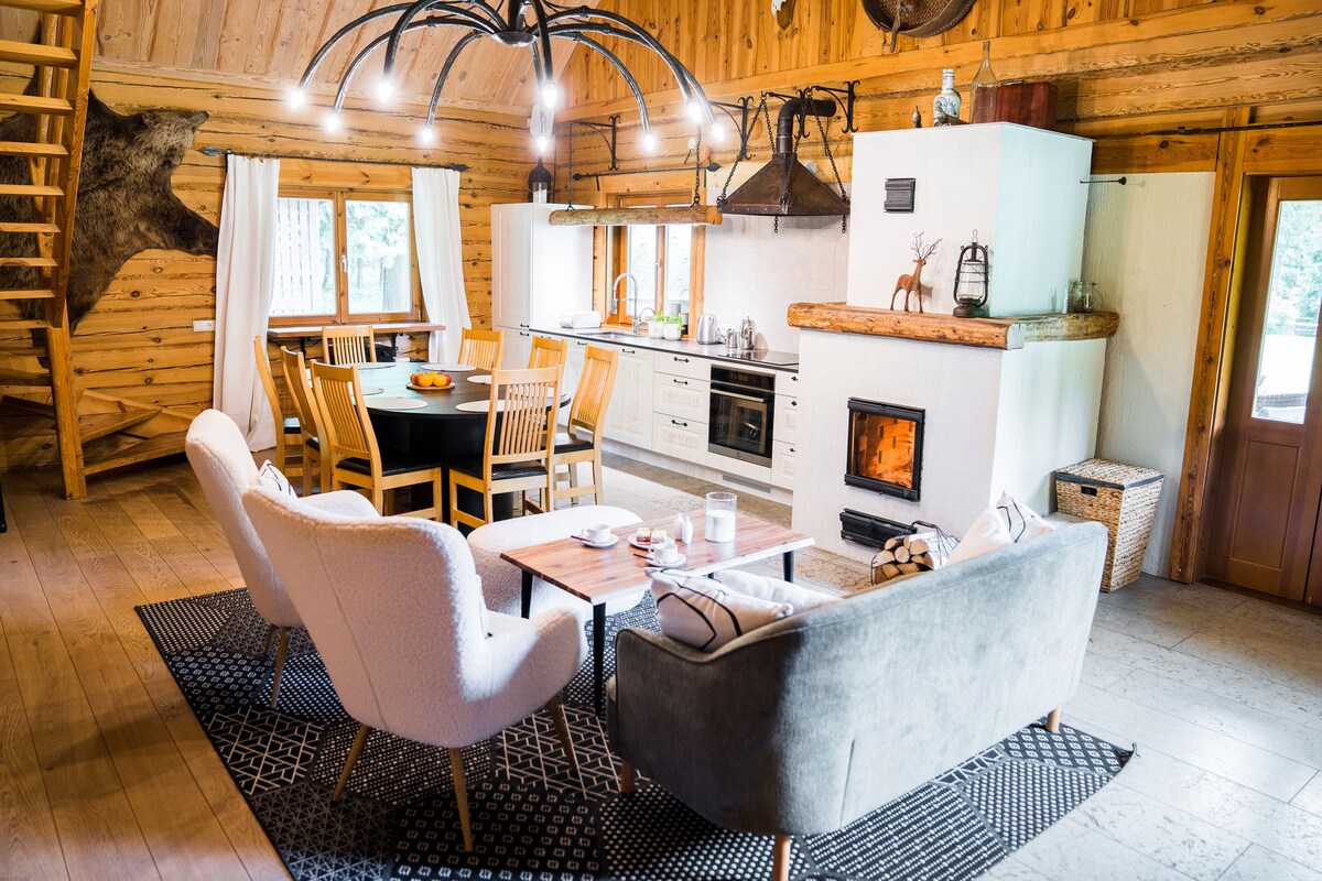 Sauna altı kişiyi rahatça ağırlayabilir, ancak terasta daha fazla kişi için yer vardır. Alt katta büyük bir çekyatta uyuyabilirsiniz, üst katta iki büyük 160 cm'lik şilte vardır. Bir merdiven sizi dışarıdan ikinci kata çıkarır. Yastık - battaniyeler, yatak takımları ve banyo havluları verilir. Mutfak, yemek pişirmek için gereken her şeye sahiptir. Dışarıda bir barbekü var, ancak kendi kömürünüzü getirin, lütfen. Ayrıca nehrin yakınında 60 EUR ekstra ücret karşılığında nakit olarak varil jakuzi de vardır.