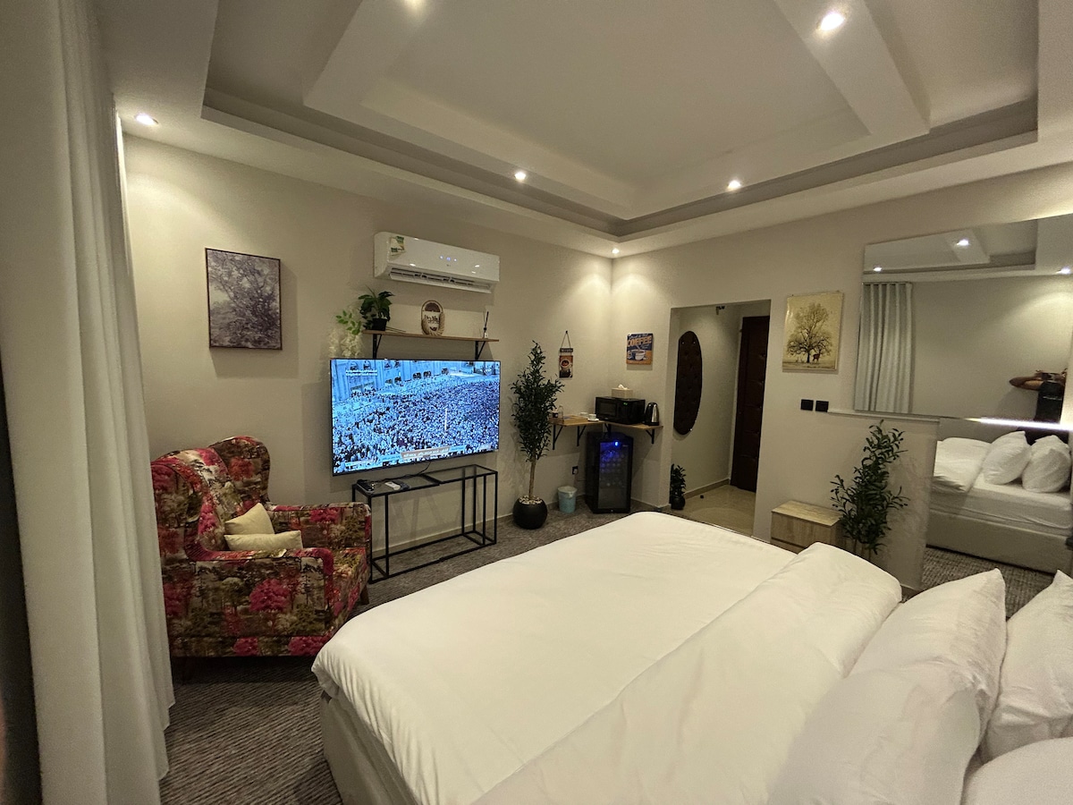 Welcome to our stylish studio in South Ubhur, Jeddah! Ideal for couples or solo travelers, enjoy a comfortable stay with a king-sized bed, smart TV, and equipped kitchenette. The sleek bathroom offers a walk-in shower and toiletries. Stay connected with Wi-Fi and relax in air-conditioned comfort. Just steps from local attractions, shopping, and dining, our studio is perfect for exploring Jeddah's rich culture. Experience a memorable stay in this captivating city!
