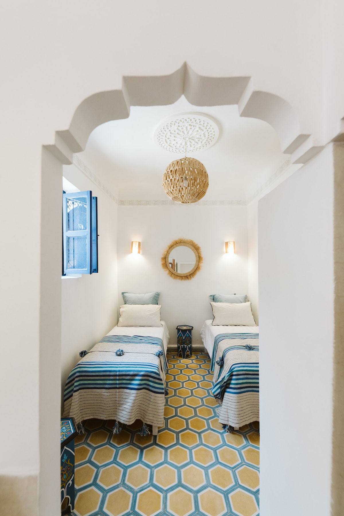 Notre Riad est une promesse d'évasion. Imaginez vos matinées bercées par le chant des oiseaux dans le patio et vos soirées sur la terrasse surplombant la ville rouge. Un mélange raffiné de zelliges traditionnels et de confort contemporain. Un salon de lecture pour s'évader, des chambres élégantes pour se ressourcer. Un patio rafraîchissant, pour le café du matin et un rooftop pour savourer le coucher du soleil. Hospitalité marocaine et confort absolu : votre parenthèse enchantée commence ici.