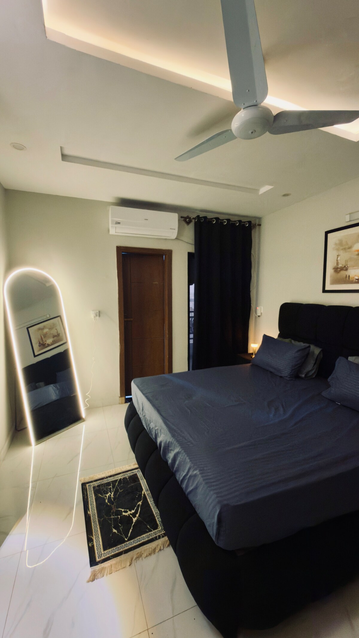 @blueoakresidences'a hoş geldiniz F-11/1 İslamabad'da her biri özel balkonlu 2 ebeveyn banyolu yatak odası, tuvalet, UPS yedekleme, hızlı kablosuz internet bağlantısı, kendi kendine giriş ve 58 inç akıllı TV bulunan 140 m² genişliğinde daire. Mutfak, sıcak su, ücretsiz otopark, 7/24 asansör dahildir. 4'ten büyük gruplar için 6 misafire kadar 2 ekstra yer yatağı sağlanmaktadır. 3+ gece için istek üzerine beşik mevcuttur (5000 PKR). Loafology, Nando's, Asian Wok, KFC, Al-Fatah'a birkaç adım mesafede. Hemen dışarıda aile dostu park.