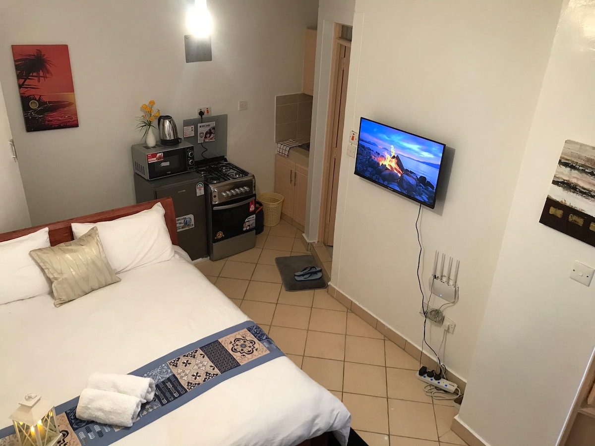 Modern olanaklarla donatılmış bu benzersiz ve sakin kaçamak stüdyo dairesinde rahatlayın. Thika yolundan sadece 2,5 km uzaklıkta, 11 Ruiru çıkışından geçerek ve JKIA'ya sadece 25 km ve yeni inşa edilen Kenyatta Üniversitesi Hastanesi'ne 1,5 km ve Tatu City'ye sadece 800 metre uzaklıkta. Hem uzun hem de kısa süreli konaklama için uygundur. Olanaklar: Ücretsiz otopark Sınırsız kablosuz internet bağlantısı. Güvenlik kameraları TV (55 inç Samsung Qled Slim TV) Ses sistemi (JBL 9.1 Sound-bar) Extreme Bass Netflix, YouTube Kahve makinesi