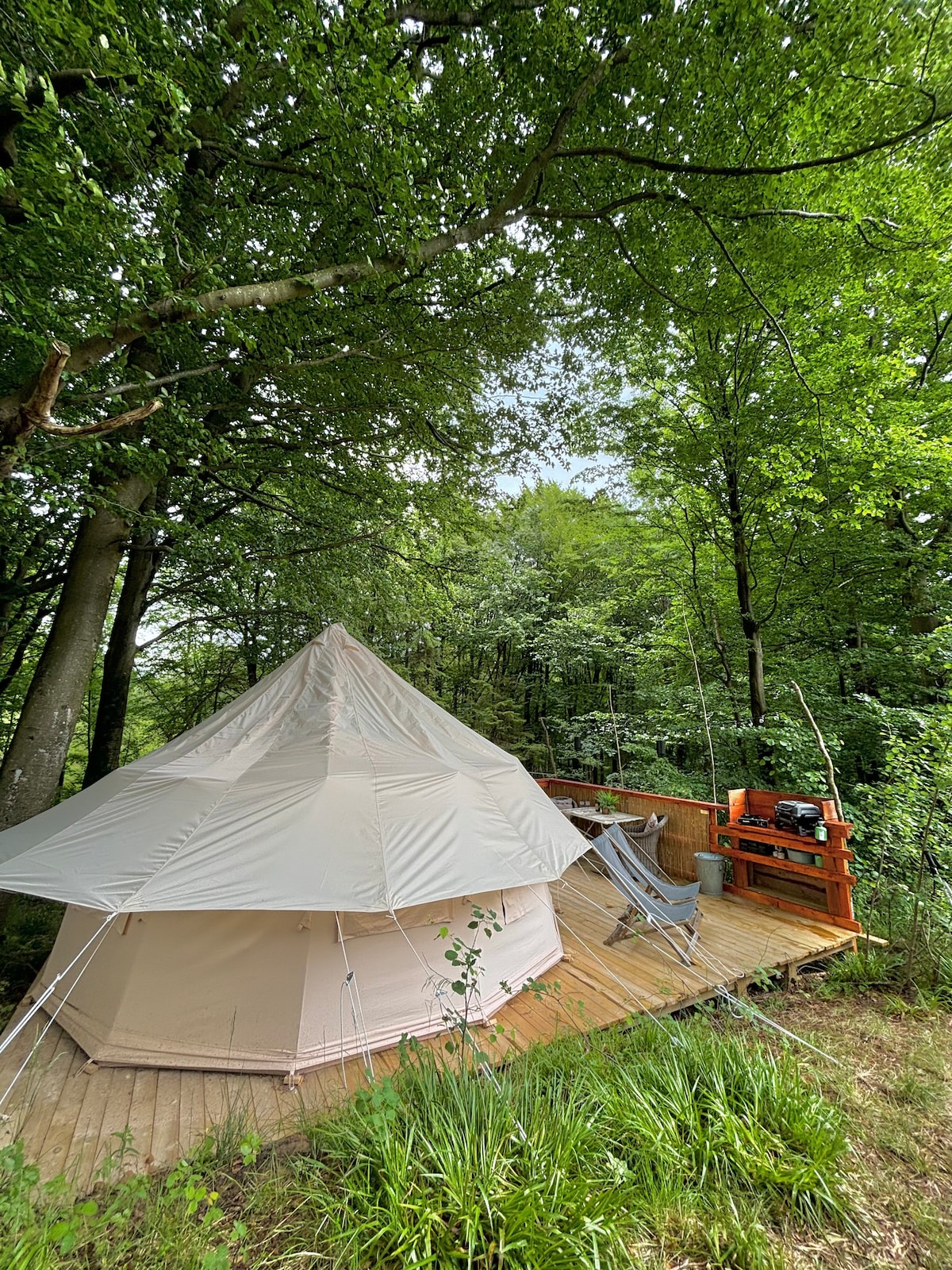 Burada doğaya yakınlaşırsınız. Ormanın ortasında, büyük bir yatak, Fossflakes yorganlar, ahşap teras, özel banyo, açık hava duşu ve tamamen benzersiz, huzurlu bir atmosferi olan bu 28 m2'lik lüks kamp çadırından manzaranın tadını çıkarın. Çadır özel ormanda bulunuyor, bu nedenle rahatsız edilmediniz. Akşamları fenerleri yakın veya çadırın şeffaf tepesinden yıldızları seyredin. Gazlı ızgarada veya trangia'da yemek pişirebilirsiniz. Tencere/tava/kahve demleyici mevcuttur.
