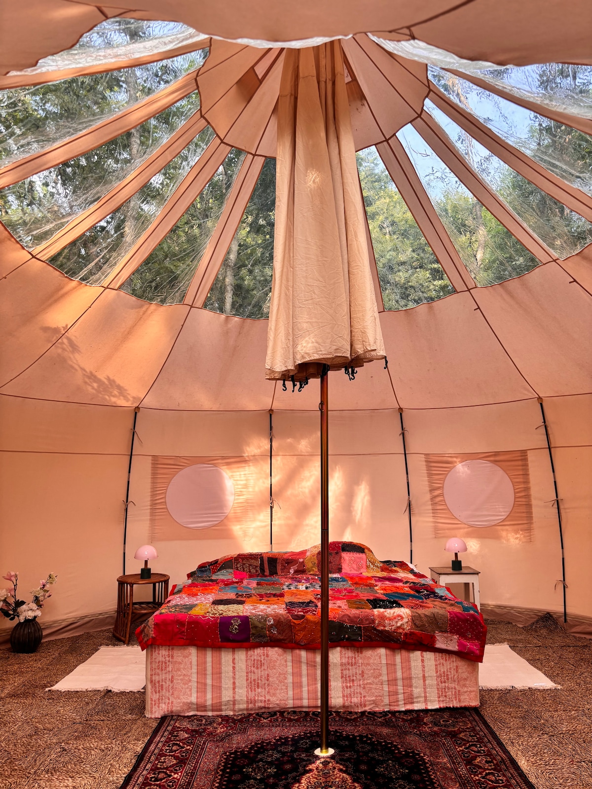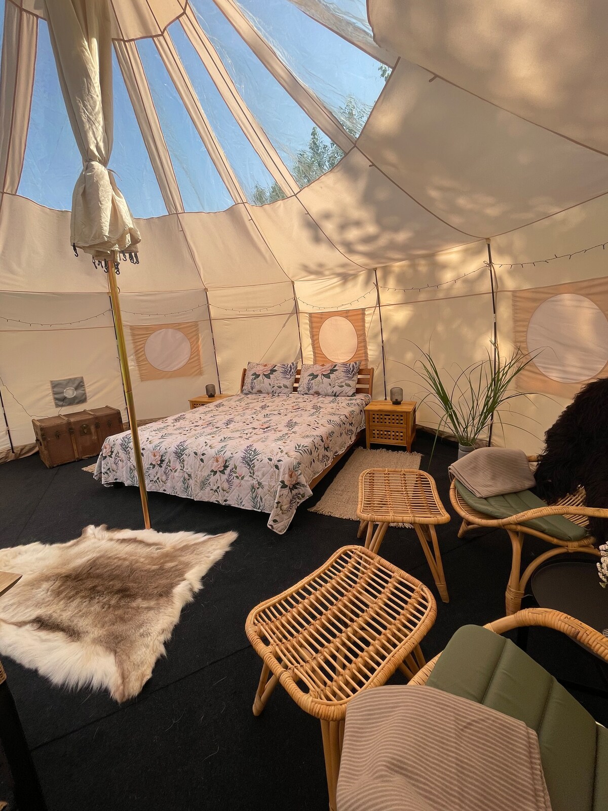Har I lyst til campinglivet, men vil gerne sove lidt mere luksuriøst? Så prøv vores dejlige store Starglaze Glamping telt, med en radius på 6 m. Det er det eneste telt på marken. Teltet er udstyret med en dobbeltseng og ved 4 personer, er det tænkt som 2 voksne og 2 børn. Der vil være to madrasser der kan foldes ud til rådighed. Madlavningen vil foregå udendørs, der er et bålsted samt kul-grill til rådighed. Når I ankommer er sengene redte og der stilles også håndklæder rådighed.