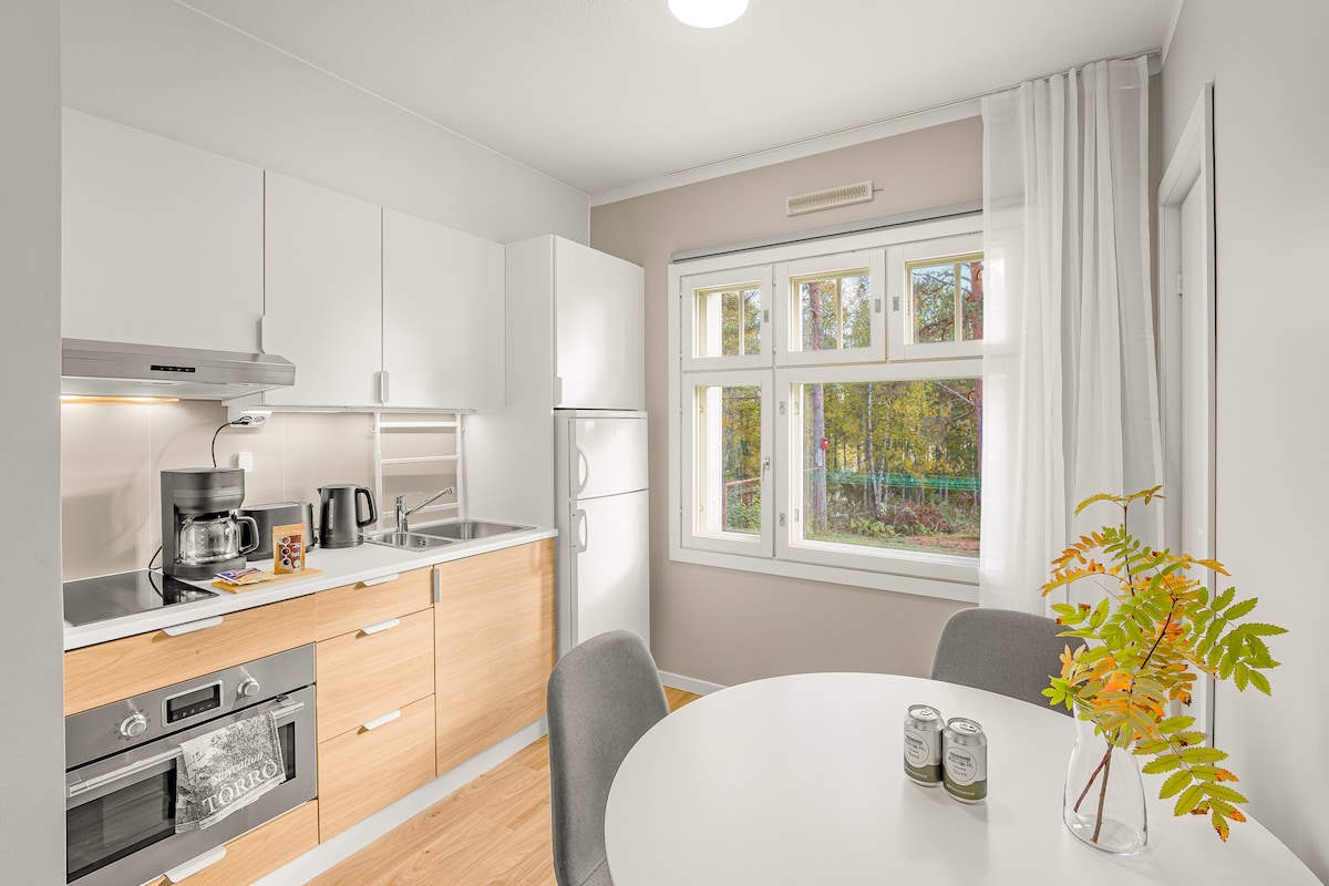Vuokatti'nin göbeğinde, Vuokatti Tepesi'nin doğrudan manzarasına sahip huzurlu bir çam ormanında yer alan aydınlık, ferah ve evcil hayvan kabul edilmeyen tam donanımlı tatil dairesi. Kayak pistlerine ve kros parkurlarına yakın. Misafirlerin favorisi, uzaktan çalışma ve arabasız seyahat için uygun. 18 Ocak 2026'dan sonra yapılan rezervasyonlarda temizlik dâhildir. Karartma perdeli iki sessiz yatak odası. Mükemmel depolama alanı. En yakın market, restoran ve elektrikli araç şarj istasyonu sadece birkaç yüz metre uzakta.