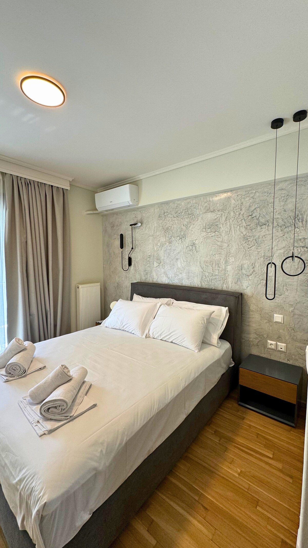Şehir merkezine 15 dakika mesafede 70 metrekarelik lüks daire. Yürüyerek, otobüsle, metro ile erişim. Üst kat, Selanik'in tarihi kasabasının üzerinde dağ manzaralı balkon. En iyi malzemeler ve ahşap kaplamalarla çağdaş, akıllı tasarım. Tam donanımlı mutfak, Nespresso, 50inç TV, yüksek hızlı internet, Netflix ve Disney+, birinci sınıf yatak,çamaşır/kurutma makinesi Denize birkaç saniye, Müzik Salonu'na 10 dakika mesafededir. İş için seyahat edenler ve gezginler için idealdir.