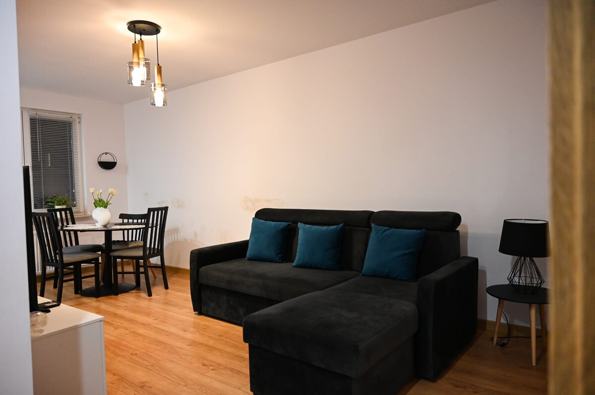 To stylowe miejsce na pobyt jest idealne dla pary lub na podróż w celach służbowych. Mieszkanie posiada osobną sypialnie oraz rozkładaną kanapę. W mieszkaniu znajduje się telewizor. W okolicach sklepy oraz market. Nieruchomość znajduje się w wieżowcu. Brak wi-fi w mieszkaniu. Regulamin mieszkania: - Cisza nocna od godziny 22:00-6:00 - Zakaz palenia w mieszkaniu