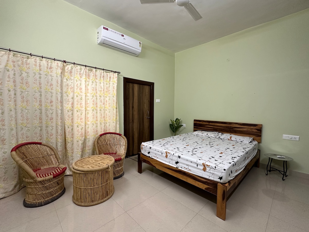 Rahat 1BHK Süit – Huzur ve Konfor için Mükemmel! Büyüleyici 1BHK süitinde huzurlu bir inzivanın tadını çıkarın. Süit şunları sunar: Dinlendirici bir uyku için 2 adet konforlu çift kişilik yatak. 6-8 kişinin dinlenip sohbet edebileceği geniş bir kanepe. Mutfak gereçleri, mikrodalga fırın, buzdolabı ve daha fazlasıyla tam donanımlı bir mutfak. Gayzer ve duşlu ferahlatıcı bir banyo. Aracınız için güvenli otopark. Tek başına veya 5 kişiye kadar konaklamalar için ideal olan bu mekân, konaklamanız boyunca konfor ve rahatlık sağlar. Kiralık araba/bisiklet/activa sağlıyoruz!
