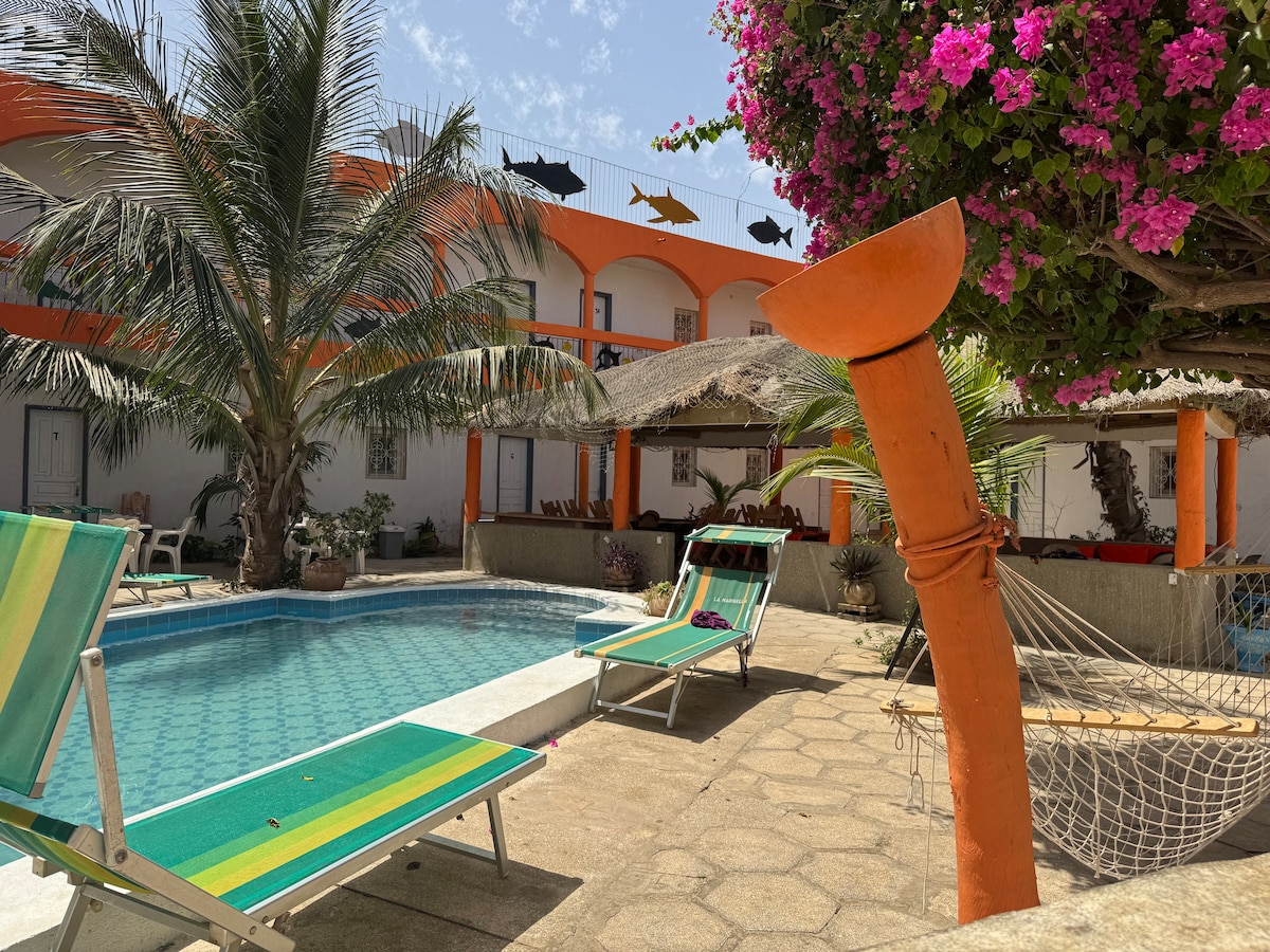 Bu şık konaklama yeri iki kişilik seyahatler için mükemmeldir. Kaolack'a seyahat eden danışmanlar ve uzmanlar için mükemmeldir. Ofis masası ve sandalyesi, yatak odası ve klimalı oturma odası vardır. Kaolack şehir merkezine 5 km uzaklıktaki yeni Ulusal Yol 1 Dakar-Kaolack üzerinde yer almaktadır.