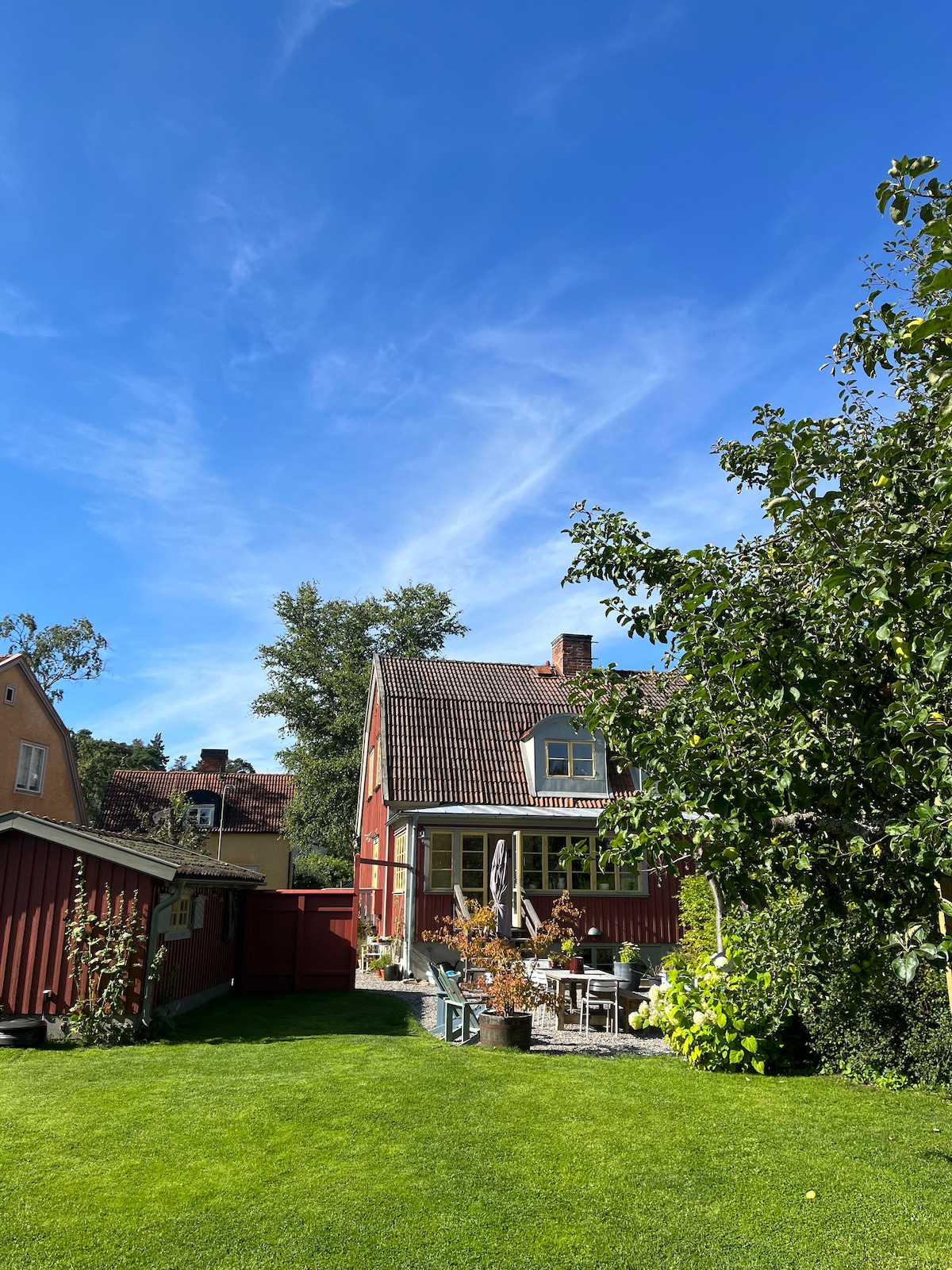 A wonderful 260 sqm house in classic Enskede. 5 bedrooms and a new private spa-area with movie room, jacuzzi, sauna & spa. The charming house from 1920:s has open fire, spacious rooms, PS5, Oculus Quest, HBO, Netflix, pinball machine , table tennis, bikes etc The streets are lush, child friendly, beautiful and calm. The garden is amazing with sun set patio, out door dining table and grill, overlooking the fruit trees and flowers. 5 min walk to subway, 10 min to Stockholm centre.