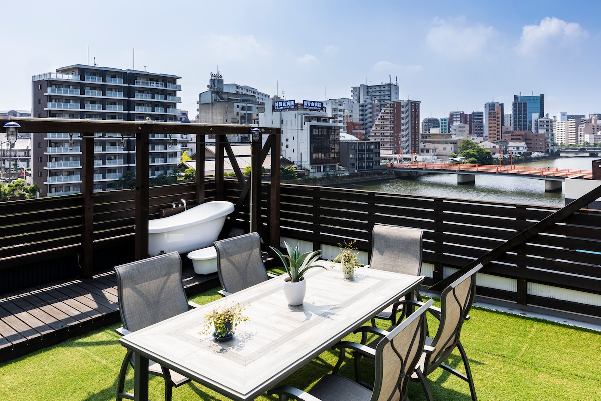 Hotel BAL ROOFTOP “Stunning Views · Prime Location · Rooftop Sauna” 🌿 Private Balcony Enjoy city views of Canal City and distant mountains. At night, relax with a quiet, private moment above the lively streets. 🚶 Prime Location 1 min to convenience stores, supermarkets, and restaurants. Easy access to Hakata Station & subway. 🛁 Spacious & Comfortable Large bathtub for ultimate relaxation. 👥: 2–6 guests 📏: 135㎡ (including balcony) 🛏 ・Double Beds × 2 ・Sofa Beds × 2 (Up to 6 guests)