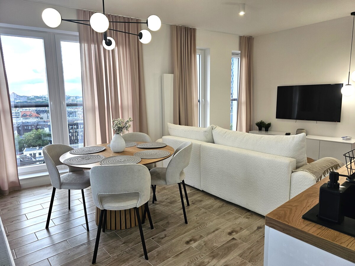Katowice'nin panoramasına 12. kattan muhteşem bir manzaraya sahip lüks, ferah bir daire. İki ayrı yatak odası ile maksimum 6 kişi için tasarlanmıştır. 1x yatak 140x200 cm 1x yatak 160x200cm 1x çekyat 140x200cm Hem kısa hem de uzun süreli konaklamalar için zorlu müşer için idealdir.