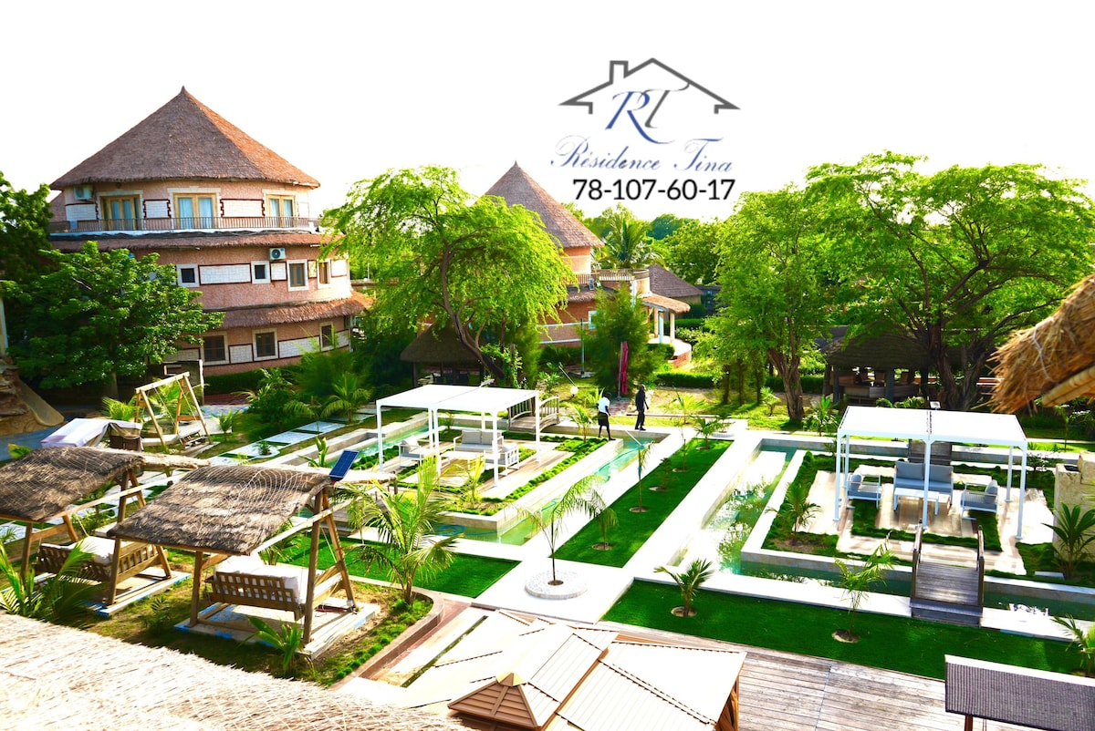 1 case traditionnelle sénégalaise (avec salle de bain équipée) dans un terrain privatif avec très beau jardin. chambre supplémentaire dans maison d'hôte à côté avec salle de bain Climatisation dans la grande case Logement unique A cela s'ajoute une très belle cuisine-terrasse ouverte, ombragée et équipée. situation proche du centre dans un endroit très tranquille (peu de voisinage). Le Village est à 5 minutes à pied. Deux piscines se situent à proximité. Le Siné Saloum est à 5 minutes à pied