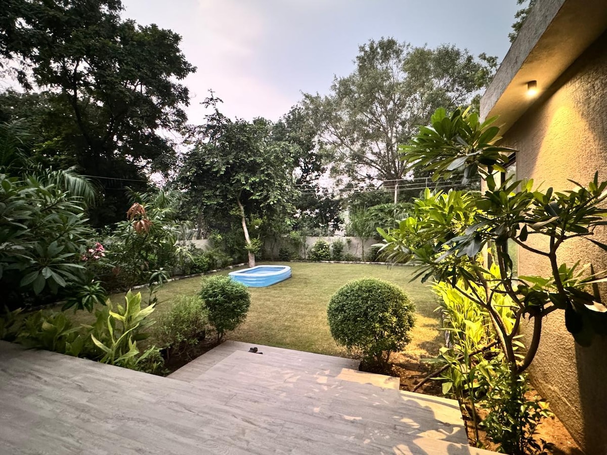 Privacy First: 4 large bedrooms 🛌, fully separated from each other in different blocks for complete privacy. Indoor Comfort: Huge gathering hall 🎉 & a spacious, well-equipped kitchen. Outdoor Luxury: Sparkling Swimming Pool 🏊 & relaxing Jacuzzi 🛁, plus garden sit-out areas. The View: Experience soothing, uninterrupted green farmland vistas 🌳 every day. Perfect Blend: Rustic comfort meets natural tranquility. Book your serene getaway now! ✨