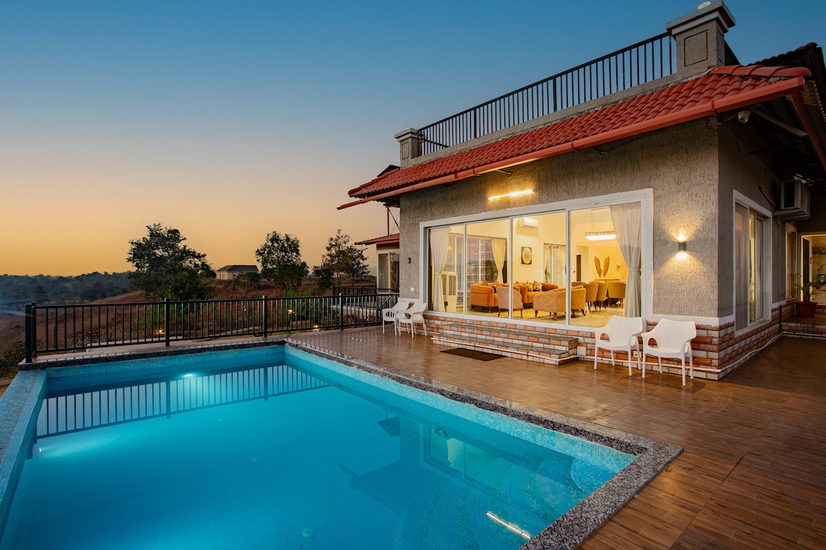Superhost and a Guest Favourite property!!! We welcome you to this modern 3BHK private pool villa in Karjat, surrounded by greenery and fresh air. Enjoy stunning views, open airy spaces, and your own exclusive pool (open 24/7) — perfect for a relaxing getaway with family, friends, or your partner. We look forward to offering you a memorable experience with your loved ones.