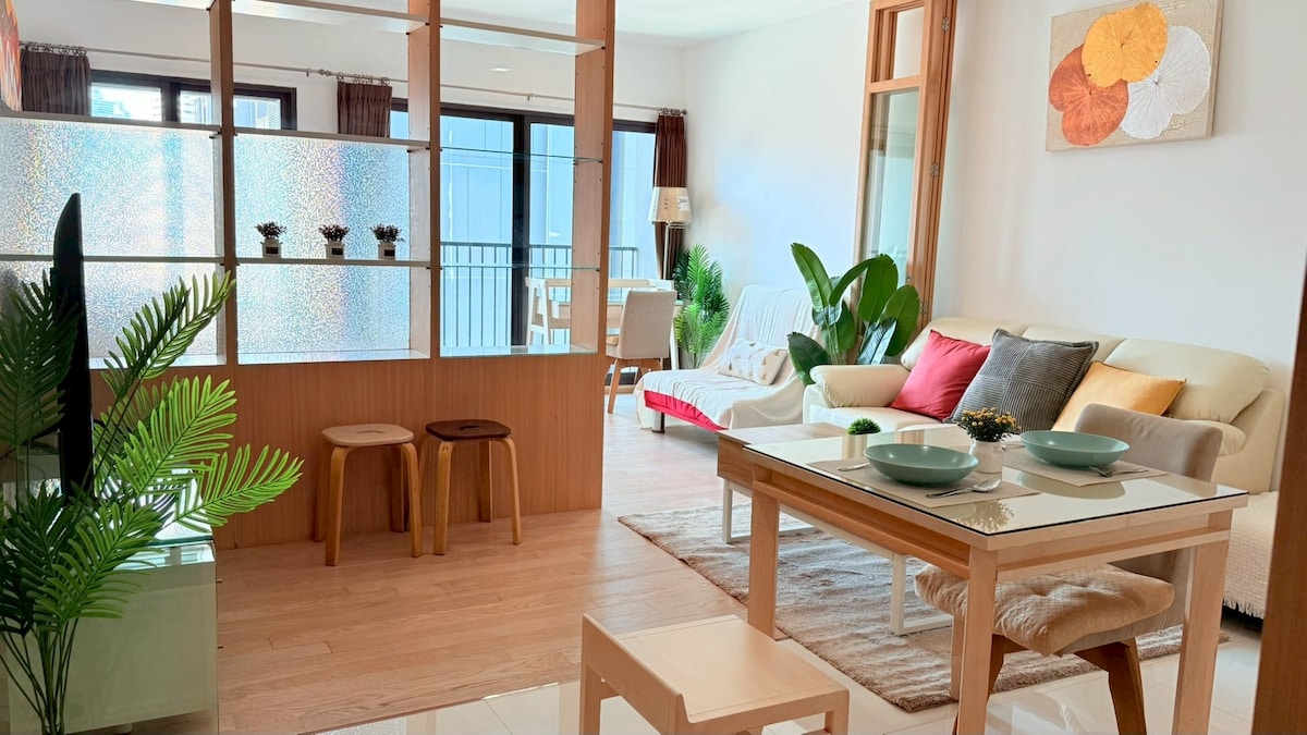 This beautiful Japanese-inspired 60 sqm unit has everything you need for a pleasant stay. The bedroom king-sized bed and personal workspace, and opens onto a spacious semi-outdoor bathroom with a wooden ofuro tub that fits two, and leads to a large walk-in closet. The living room includes a cozy sofa bed and a Ultra HD Smart TV. The kitchen is well-equipped with a microwave, range-hood, electric hob and refridgerator. The large picture window offers a view of the gardens and swimming pool.