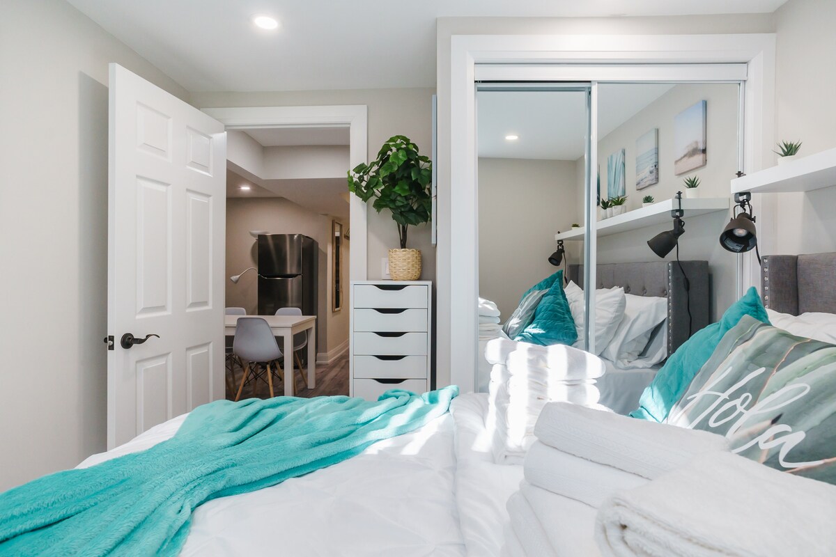 İş, eğlence veya aile zamanı fark etmeksizin sizin için ideal bir yerimiz var. Yakın zamanda yenilenen süit şunları içerir: - Ayrı anahtarsız giriş. - Dolaplı 2 yatak odası - 55 inç TV'li oturma odası. - Depolama ve yemek alanlı tam mutfak - 2 tam banyo (1 ebeveyn banyosu) - 2 adet tesis içi park yeri - Çamaşır yıkama. - Kablosuz internet bağlantısı ve daha fazlası. Hızlı elektrikli araç şarj cihazı - Uygunluk durumunu kontrol edin (15 $/şarj). Merkezi konum! Upper Canada Alışveriş Merkezi, marketler, restoranlar, yürüyüş yolları, parklar, golf sahası, Costco, Walmart, otoyol, Go ve daha fazlasına birkaç adım uzaklıkta.