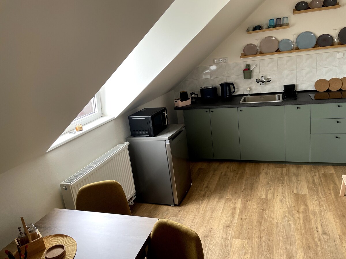 Prag'ın bir yerleşim bölgesinde, tarihi merkezden bir taş atımı uzaklıkta çatı katı dairesi. Dairede lüks mutfak, küvetli ve ayrı duşlu banyo, 2 büyük çift kişilik yaylı yatak ve geniş bir güneşlenme terası gibi tüm olanaklar bulunmaktadır. Daire, sahibinin sanat ve tasarıma olan sevgisini yansıtan özenli bir şekilde dekore edilmiştir. Havaalanına arabayla 20 dakika, binanın önünde ücretli otopark ve tarihi merkezden 300 metre uzaklıktadır. Kısacası rüya gibi bir daire.