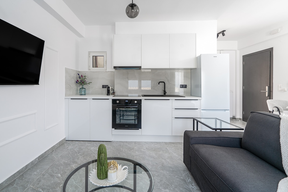 Sıcak, güler yüzlü, modern, 35 m²'lik zemin katta, tam donanımlı ve mobilyalı bir alan. 1 çift kişilik yatak, TV, buzdolabı, mutfak, 24 saat sıcak su, klima, kablosuz internet bağlantısı ve girişte küçük bir teras bulunmaktadır. Nea Alikarnassos'ta sessiz bir semtte bulunmaktadır ve havaalanına (1,6 km), limana (2,5 km), şehir merkezine (2,7 km), plaja (5,2 km) ve ulusal yola erişim için bir kavşağa (1 km) çok yakındır.