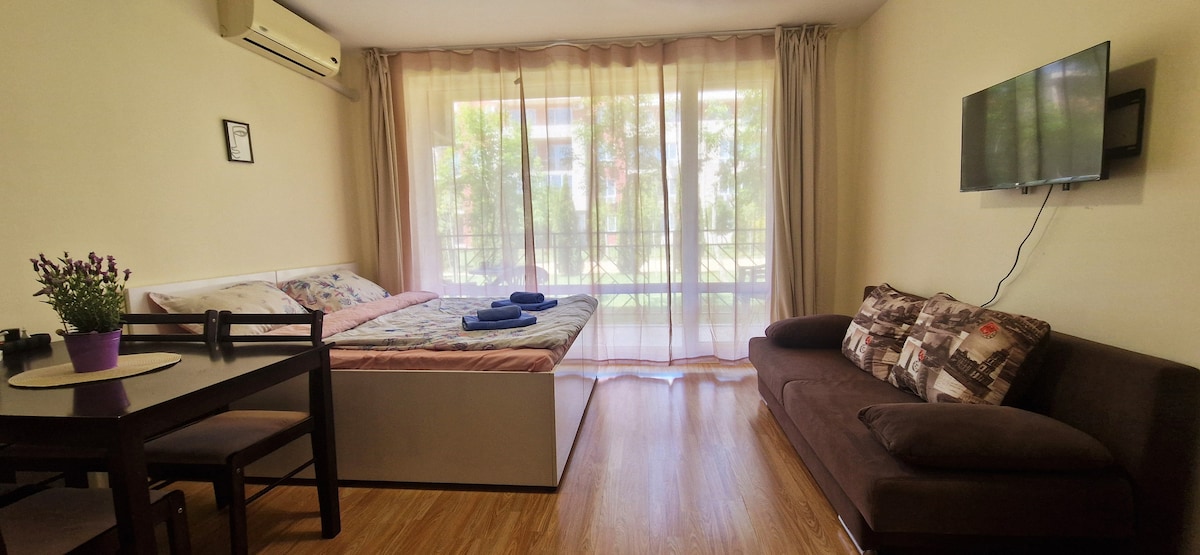 Sessiz ve huzurlu bir yer. Sunny Beach'in merkezine yürüme mesafesindedir. Kompleksin yaz aylarında 7 havuzu, restoran, kafe, açık hava spor salonu, oyun alanı, mağaza, otopark, dinlendirici bir tatil veya başka bir tatil için her şey bulunmaktadır. Stüdyoda kendi mutfağı,çamaşırhane ve mutfak gereçleri mevcuttur. Duşlu şık banyo ve güzel manzaralı teras.