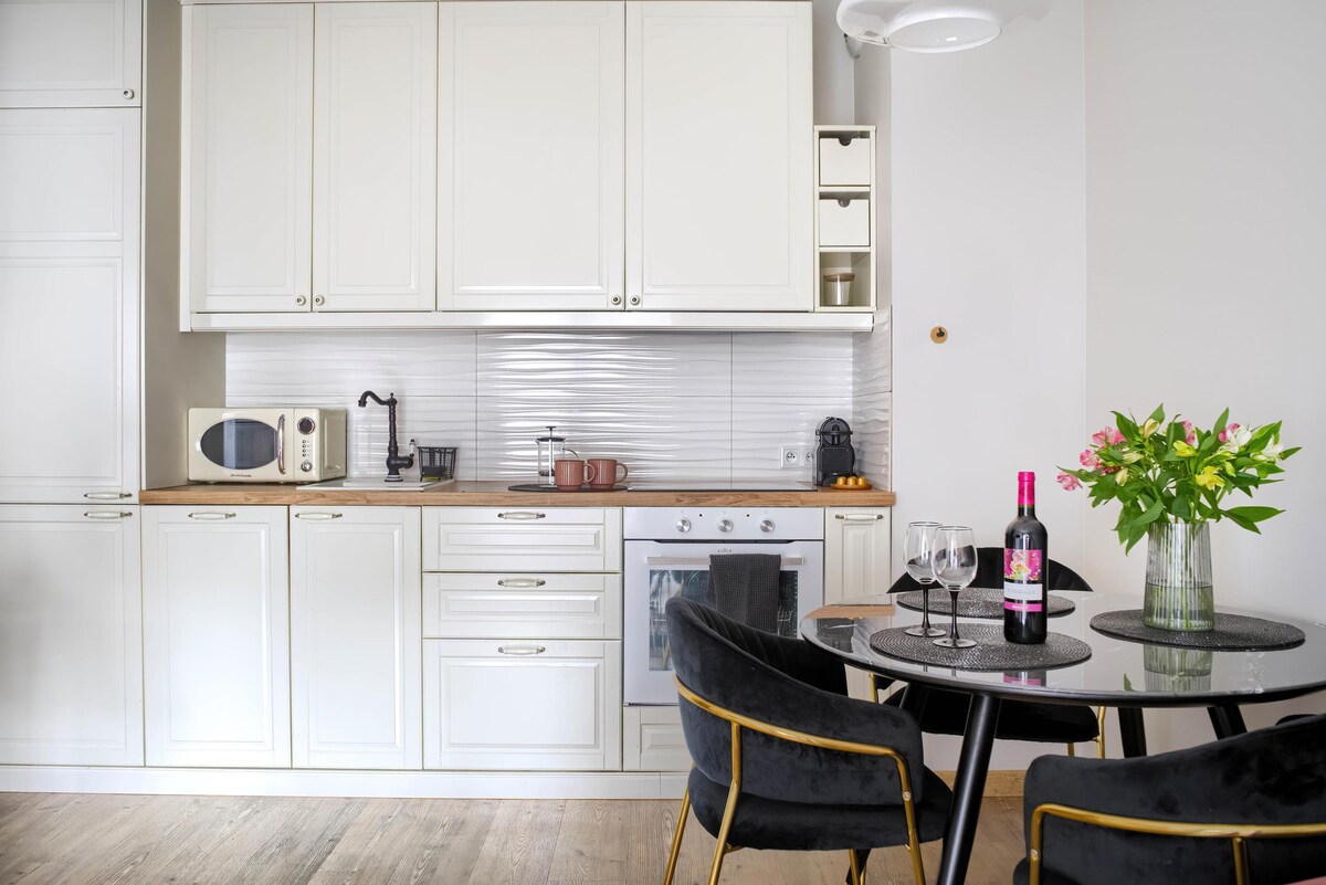Royal Apartment'a hoş geldiniz. Size kolaylık sağlamak için tasarlanmıştır, böylece ait olduğunuz yerin burada olduğunu hissedebilirsiniz. 2 katlı binada 1. kattaki bölgenin 70 metrekaresi. - 2 kanepe, sehpa, TV bulunan aydınlık oturma odası. - Tam donanımlı mutfak (indüksiyonlu ocak, fırın, bulaşık makinesi, davlumbaz, buzdolabı). - Dairenin ruhu, Wawel Kalesi'nin eşsiz manzarasına sahip köşedeki bir yatak odasıdır (çift kişilik yatak, rahat bir koltuk, bir dizi sandalye ile bir sehpa). - Banyo (duş) ve tuvalet .