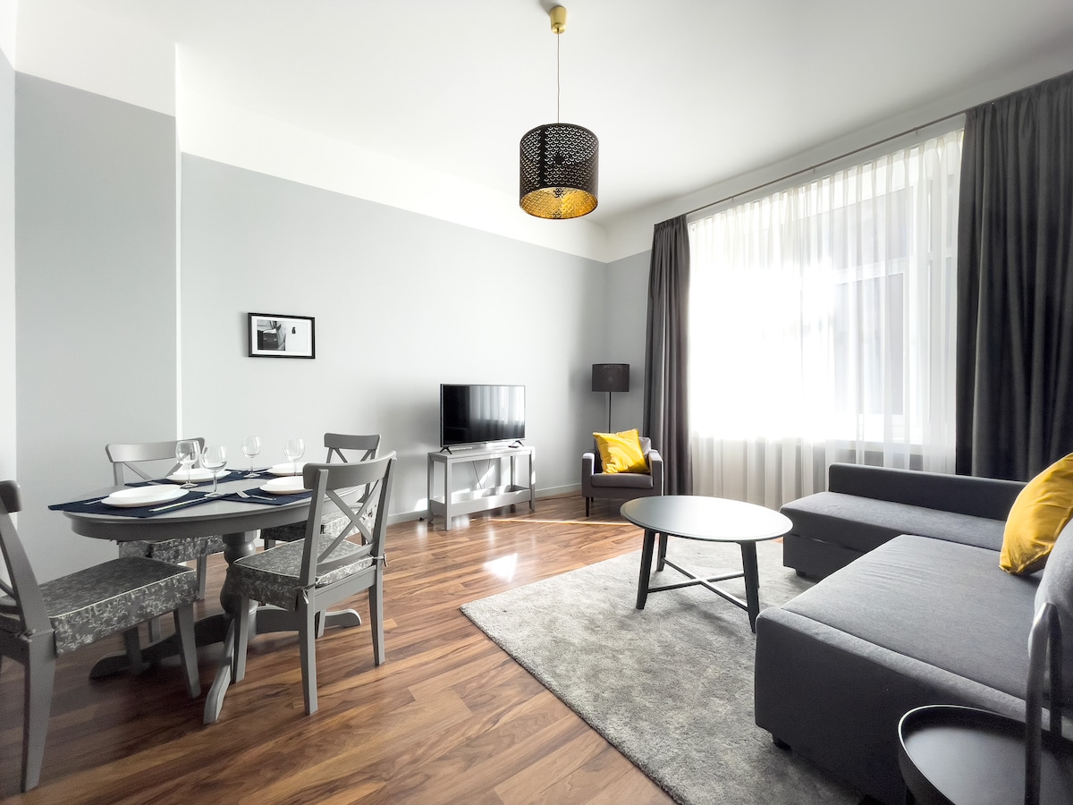 Bu 50 m2'lik tek yatak odalı daire 4 misafire kadar ağırlayabilir. Daire tam donanımlıdır. Sessiz bir yerleşim alanında, prestijli tarihi bir binada, binada güvenlik vardır. Şömine - SADECE DEKORASYON amaçlıdır. 2 kişi için 1 çift kişilik yatak hazırlanacağını, ek nevresim takımlarının ayrıca ücretlendirileceğini lütfen unutmayın.