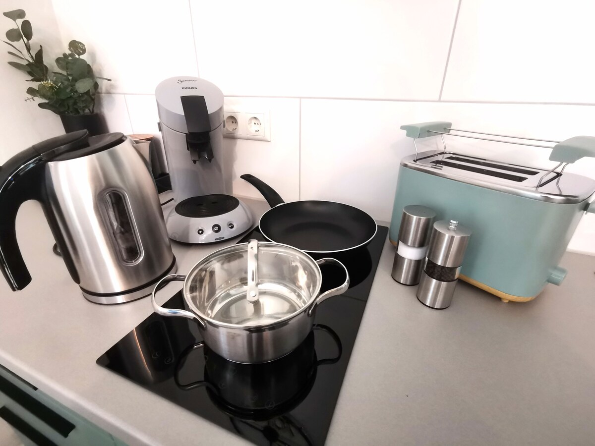 Aşağıdaki donanımlara sahip, ikiz evin (yeni bina) şık bir şekilde döşenmiş dairesi: - Yatak 140x200m - Özel banyo - elektrikli stor perde - Kahve makinesi (kahve dahil) - Devridaimli kombine cihaz olarak mikrodalga fırın - Buzdolabı - Televizyon - WLAN - Misafirler için saç kurutma makinesi - Yerden ısıtma - Merkezi havalandırma kontrolü - Kapı zili/kapı açma cihazı bulunan ayrı ses yalıtımlı kapı - Komodin - Yemek masası - tabak çanak - Ücretsiz otopark - Elektrikli araçlar için şarj imkanı - İlk donanım dahil (yatak takımı, havlu
