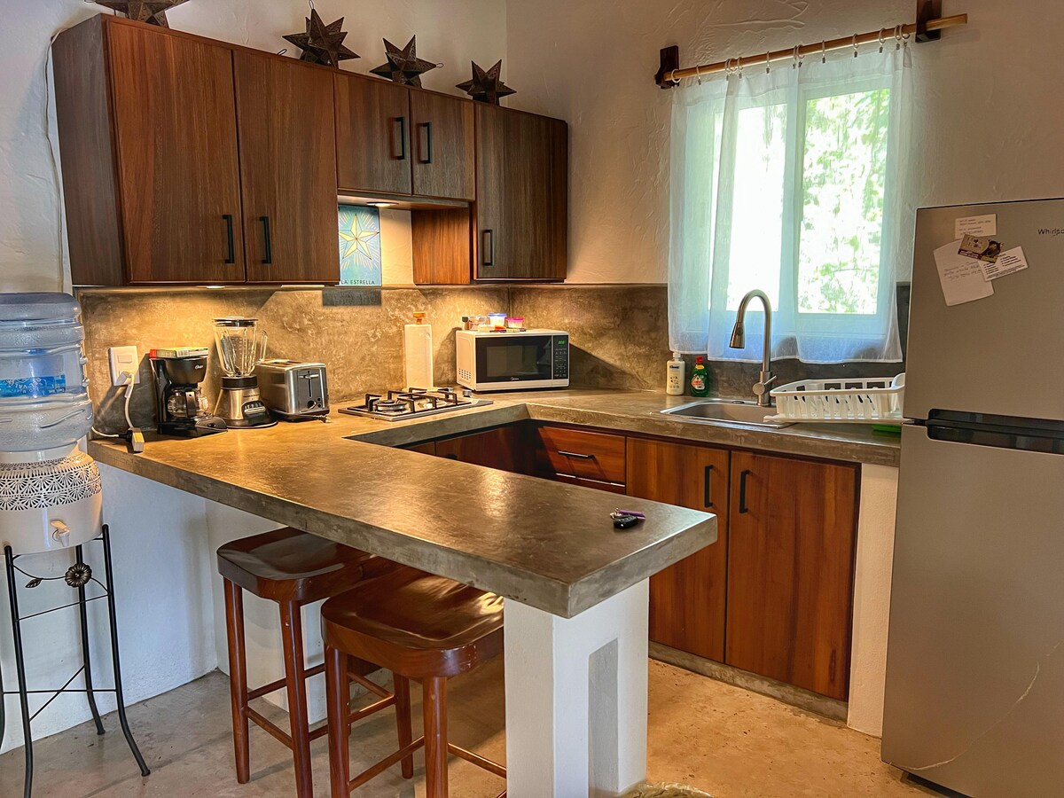 Studio Pelicanos is located in the hillside of the beautiful beach town of La Manzanilla, Jalisco. The space offers a queen-size bed, private bathroom, kitchenette, air conditioning, ceiling fan, smart TV, Starlink wifi, and balcony with spectacular views. Kitchenette includes a two-burner stovetop, refrigerator, small appliances, pots and pans, and dishes. The plaza, church, and beach are located close, about a 5-minute walk. Note: There are about 40 steps to access the 2nd floor studio